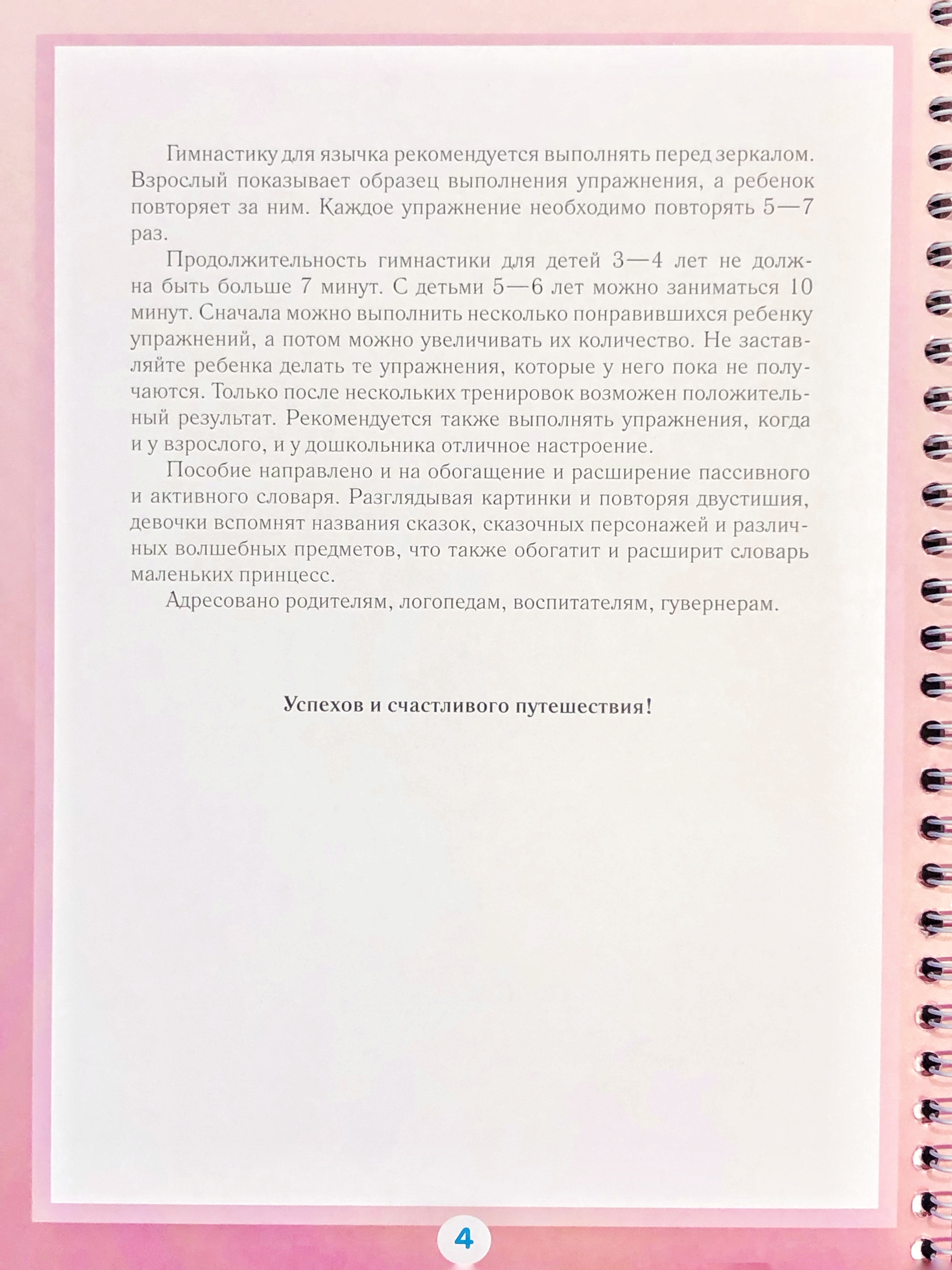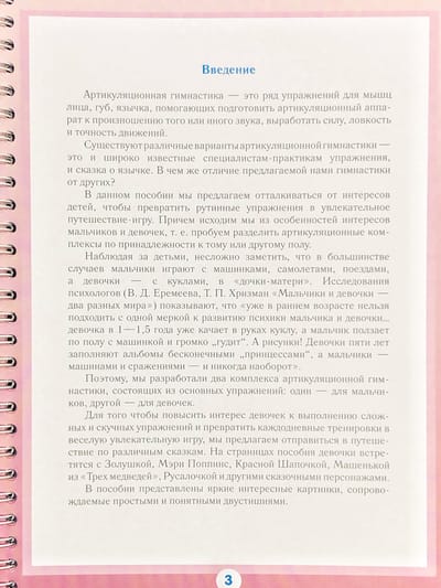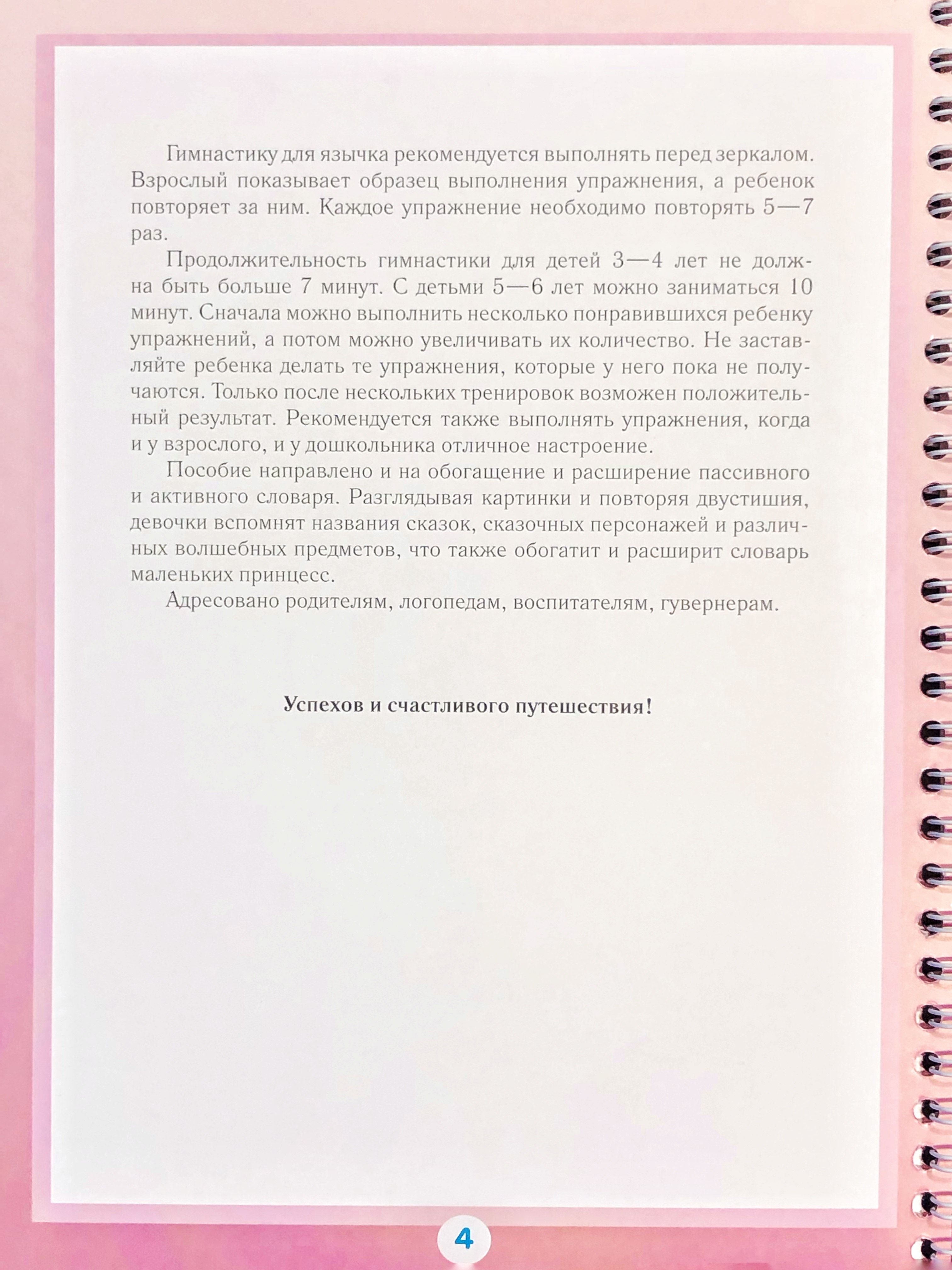 Наглядно-дидактическое пособие предназначено для подготовки артикуляционного аппарата ребенка к формированию звуков среднего и позднего онтогенеза. Для того чтобы повысить интерес девочек к выполнению сложных и рутинных упражнений, превратить каждодневные тренировки в веселое увлекательное путешествие по сказкам, мы предлагаем это пособие. В пособии представлены яркие интересные картинки, сопровождаемые простыми и понятными двустишиями.