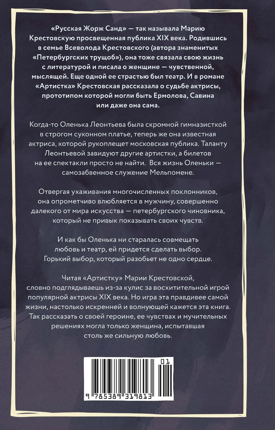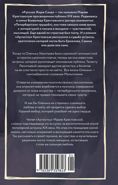 Читая «Артистку» Марии Крестовской, словно подглядываешь из-за кулис за восхитительной игрой популярной актрисы XIX века. Но игра эта правдивее самой жизни, настолько искренне и волнующе кажется эта книга. Так рассказать о своей героине, ее чувствах и мучительных решениях могла только женщина, испытавшая столь же сильную любовь.