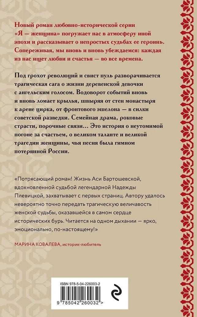 Под грохот революций и свист пуль разворачивается трагическая сага о жизни деревенской девочки с ангельским голосом. Водоворот событий вновь и вновь ломает крылья, швыряя от стен монастыря к арене цирка, от фронтового эшелона — в силки советской разведки. Семейная драма, роковые страсти, порочные связи… Это история о неутомимой погоне за счастьем, о великом таланте и великой трагедии женщины, чья песня была гимном потерянной России.