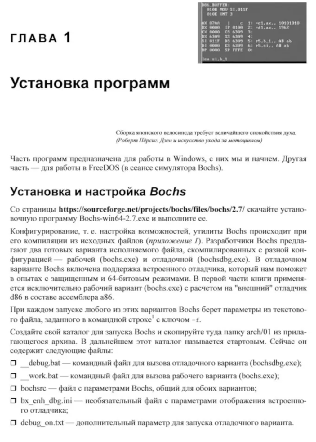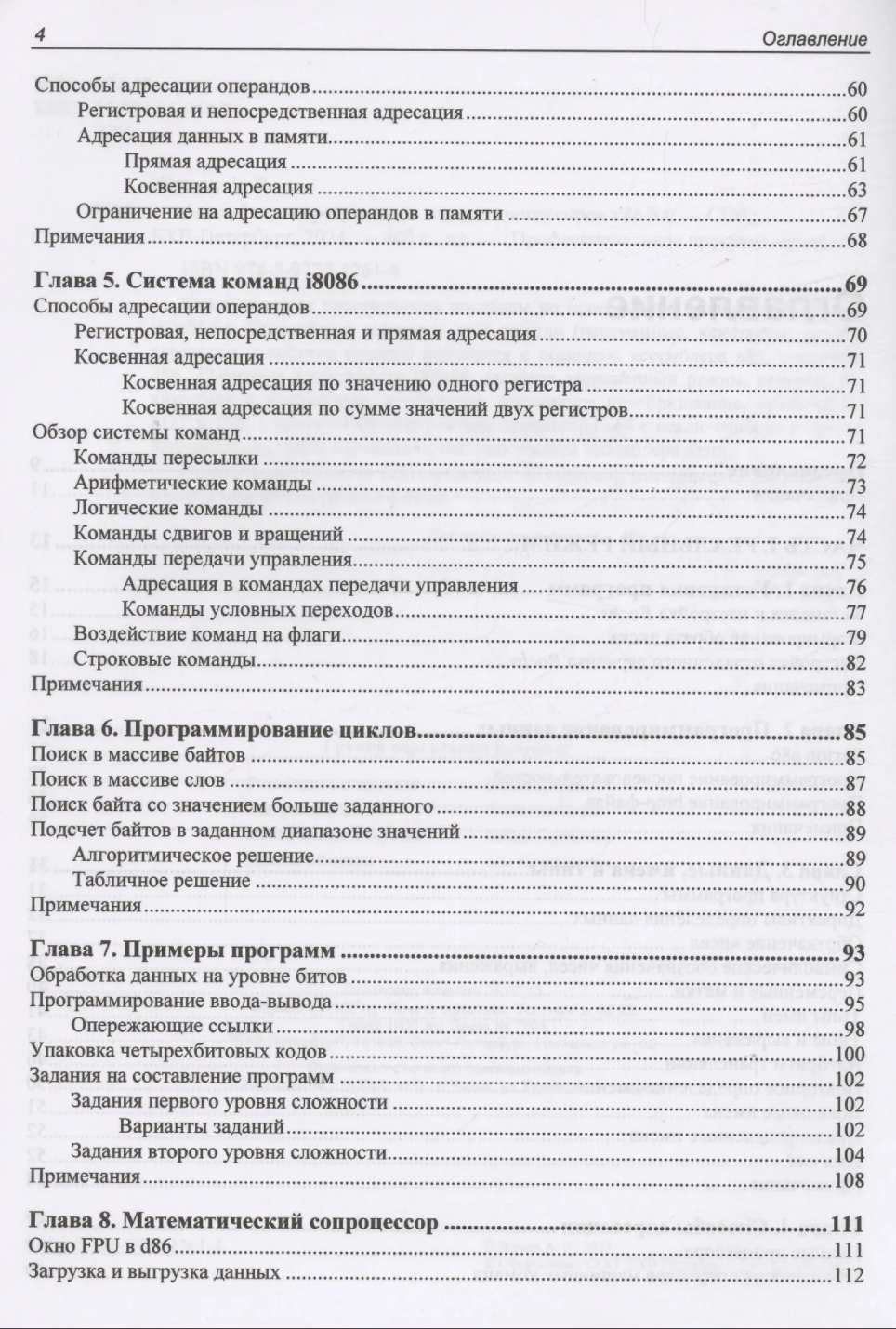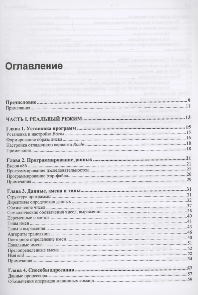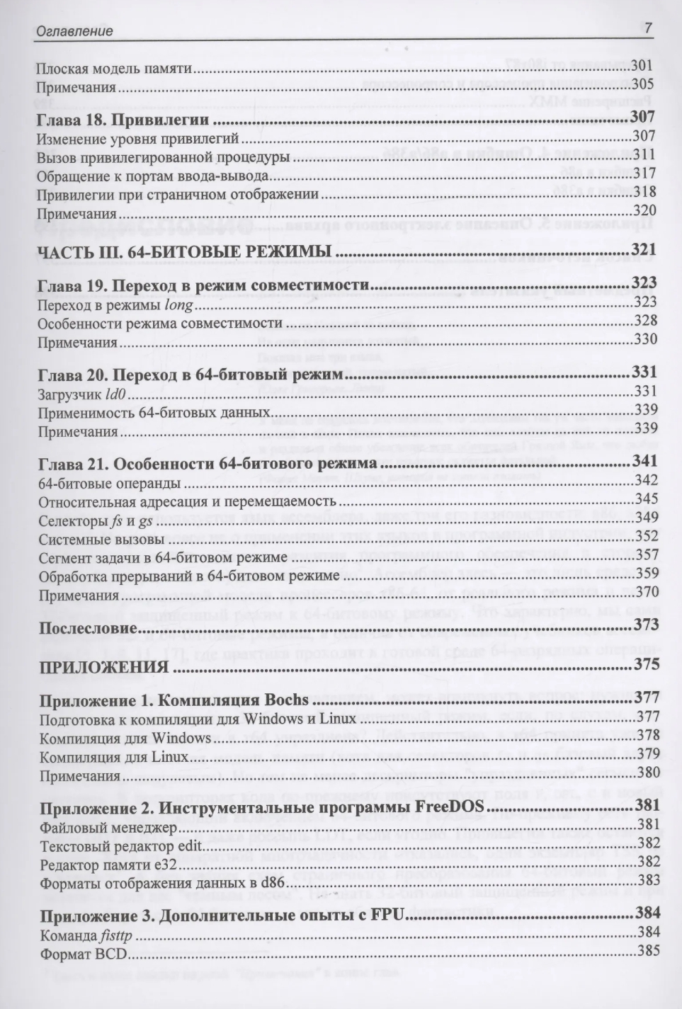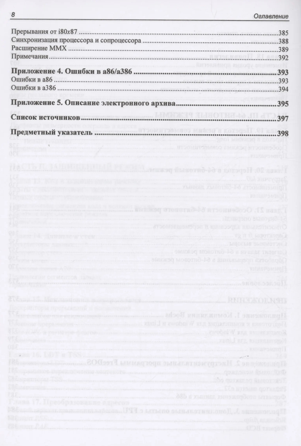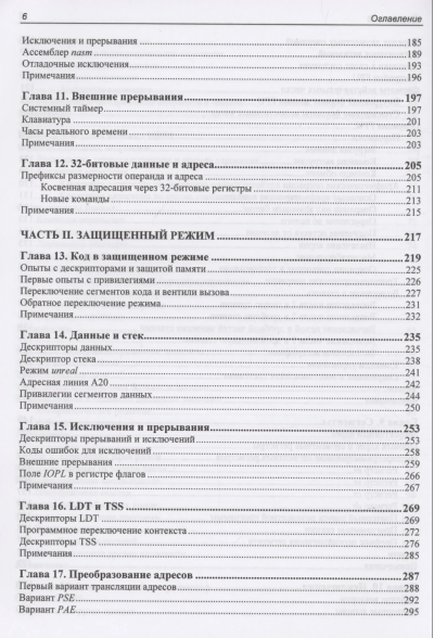 Книга является практическим пособием по программной модели процессоров i80x86/64. Простейшие элементы этой модели (переменные, константы, методы адресации и система команд) изучаются с помощью ассемблера a86, отладчика d86. 32-битные возможности i80x86, включая защищенный режим, вентили, исключения и прерывания, привилегии, страничное преобразование, исключения, LDT и TSS, а также 64-битные режимы процессора x64 с исключениями и прерываниями в long mode изучаются с использованием ассемблера nasm.