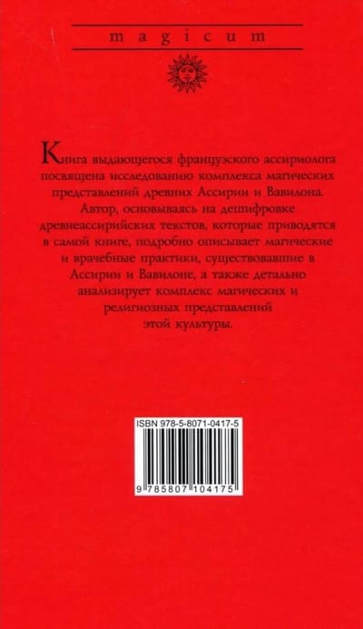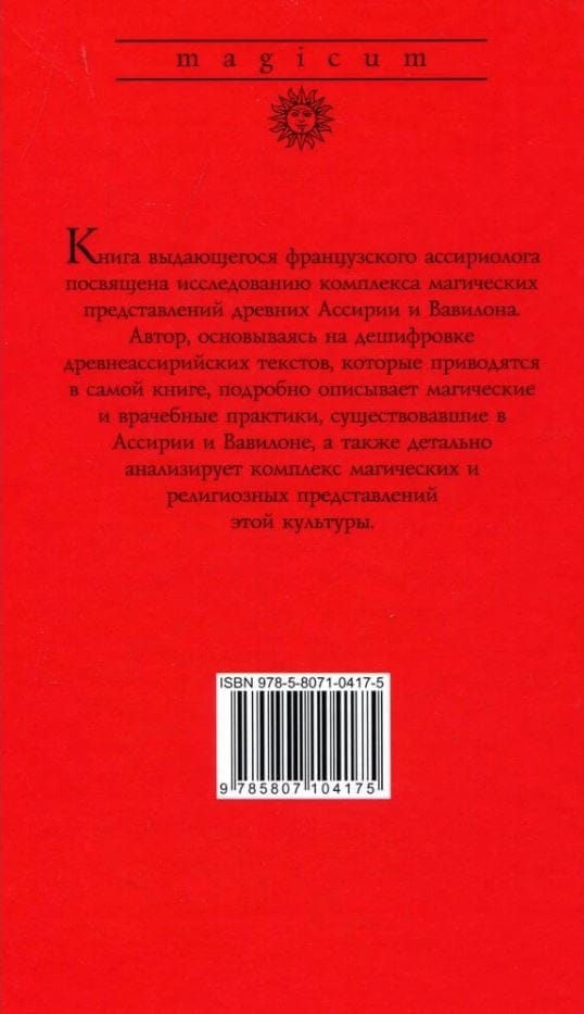 Книга выдающегося французского ассириолога посвящена исследованию комплекса магических представлений древней Ассирии и Вавилона. Автор, основываясь на дешифровке, древнеассирийских текстов, которые приводятся в самой книге, подробно описывает магические и врачебные практики, существовавшие в Ассирии и Вавилоне, а также подробно анализирует комплекс магических и религиозных представлений этой культуры.