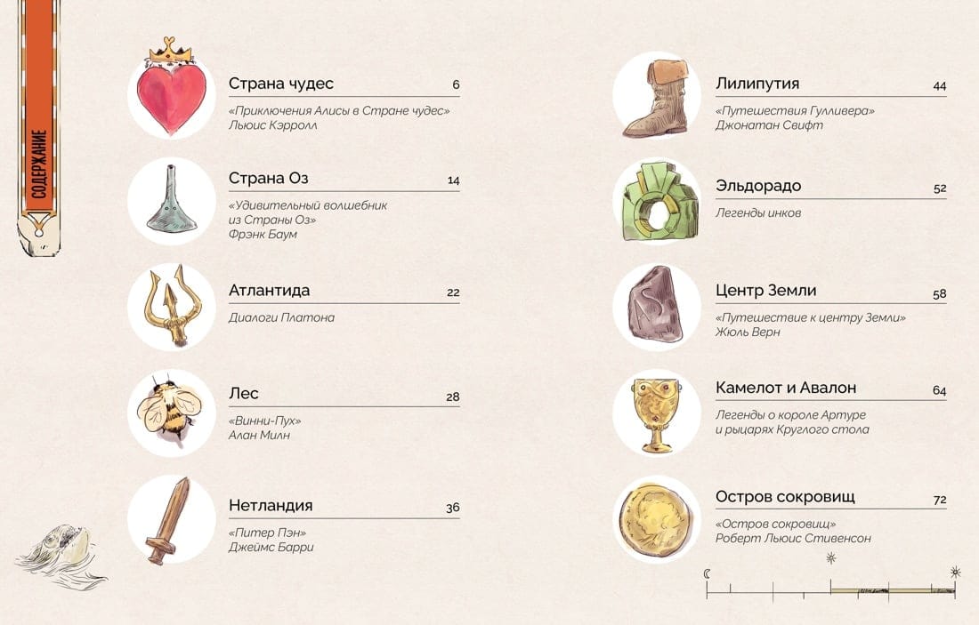 Каково это — оказаться в волшебном мире? Встретить Безумного Шляпника в Стране чудес, рассмотреть вымощенные золотом дороги в Эльдорадо, погулять по Лилипутии или зайти в гости к Винни-Пуху? С этой книгой путешествия по сказочным местам станут возможны! Отважным читателям откроется путь к потайным дверцам и тропинкам, которые ведут к далёким землям. Тем, кто решится на невероятное приключение, дорогу подскажут подробные карты и заметки путешественников, побывавших в этих невероятных городах и странах.