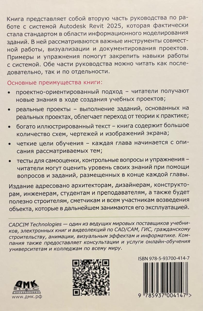 Книга представляет собой вторую часть руководства по работе с системой Autodesk Revit 2025, которая фактически стала стандартом в области информационного моделирования зданий. В ней рассматриваются важные инструменты совместной работы, визуализации и документирования проектов. Примеры и упражнения помогут закрепить навыки работы с системой. Обе части руководства можно читать как последовательно, так и по отдельности.