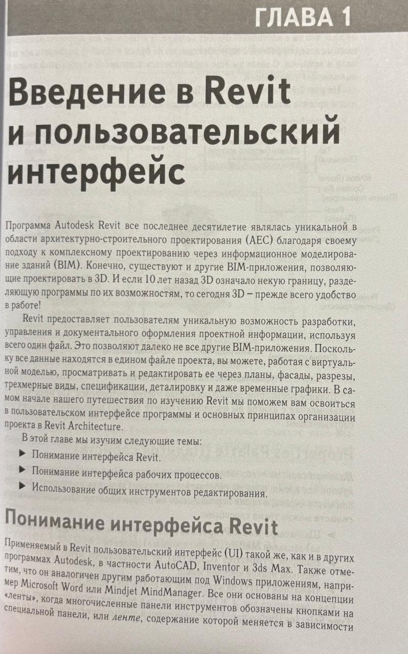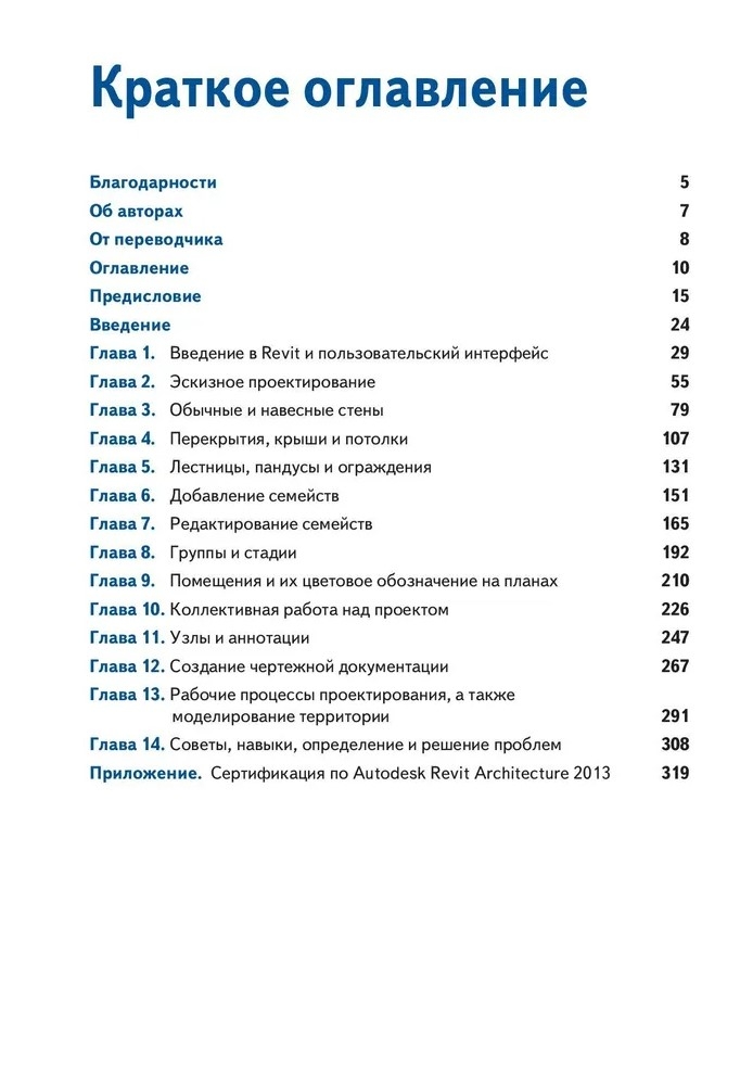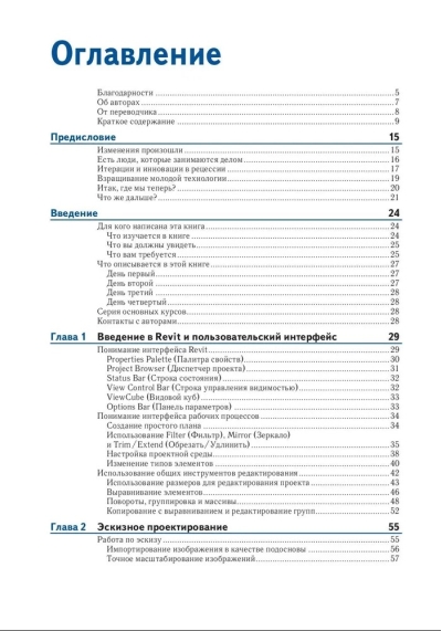 Эта книга, написанная сертифицированными компанией Autodesk американскими специалистами, посвящена основам работы с программой Autodesk Revit на основе Revit Architecture. Объясняется, как начать работу с Revit, что делать на первой (эскизной) стадии проектирования, как развивать и улучшать уже начатый проект, как создавать и оформлять спецификации и чертежи. Главная задача курса – помочь начинающему пользователю понять суть работы в Revit, принципы создания модели здания, основы проектной работы на базе технологии информационного моделирования зданий (BIM).Также большое место отводится вопросам организации проектирования в условиях внедрения BIM как на начальной, так и на последующих стадиях, взаимодействию членов коллектива, особенностям использования Revit, полезным советам и анализу возможных проблем. Издание будет полезно как начинающим, так и опытным пользователям, желающим хорошо разобраться в особенностях работы программы Revit Architecture.