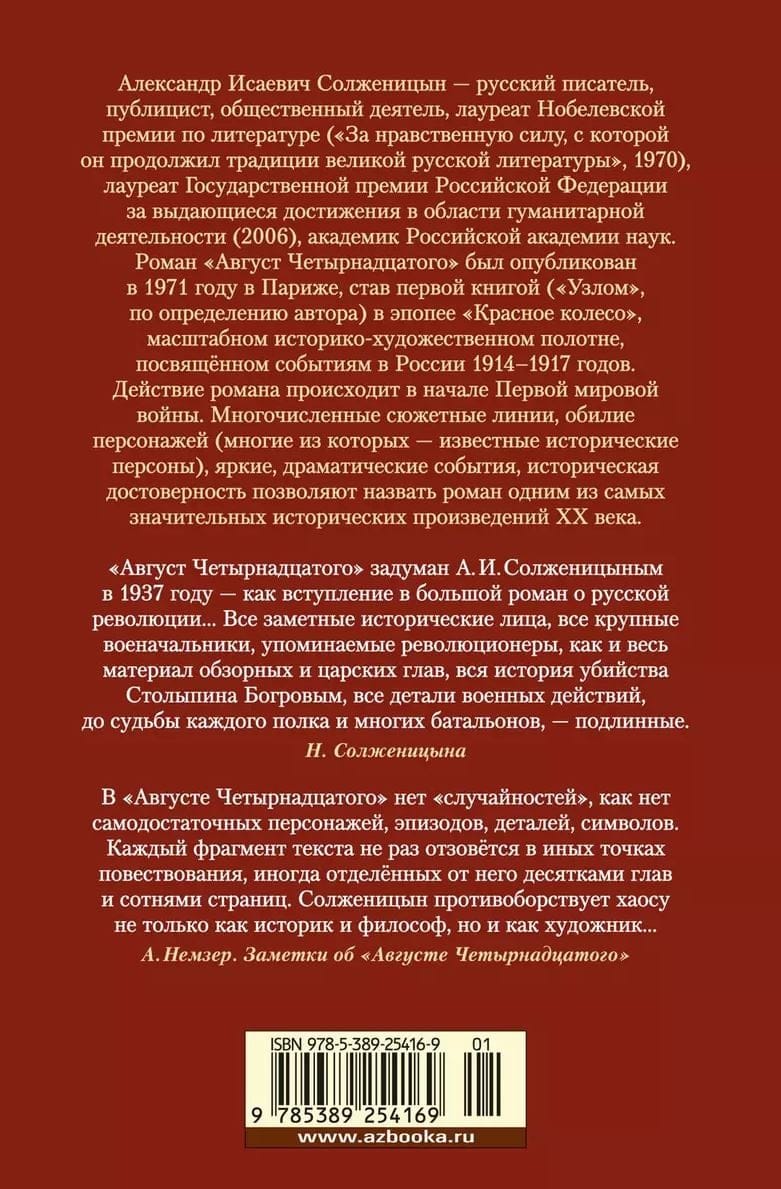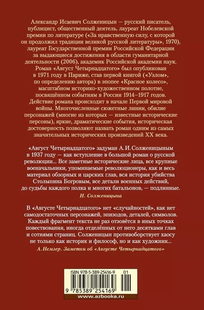 Александр Исаевич Солженицын — русский писатель, публицист, общественный деятель, лауреат Нобелевской премии по литературе («За нравственную силу, с которой он продолжил традиции великой русской литературы», 1970), лауреат Государственной премии Российской Федерации за выдающиеся достижения в области гуманитарной деятельности (2006), академик Российской академии наук. Роман «Август Четырнадцатого» был опубликован в 1971 году в Париже, став первой книгой («Узлом», по определению автора) в эпопее «Красное Колесо», масштабном историко-художественном полотне, посвящённом событиям в России 1914–1917 годов. Действие романа происходит в начале Первой мировой войны. Многочисленные сюжетные линии, обилие персонажей (многие из которых — известные исторические персоны), яркие, драматические события, историческая достоверность позволяют назвать роман одним из самых значительных исторических произведений ХХ века.