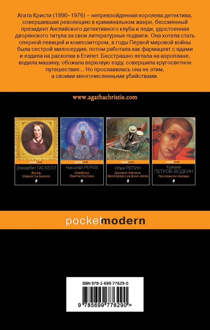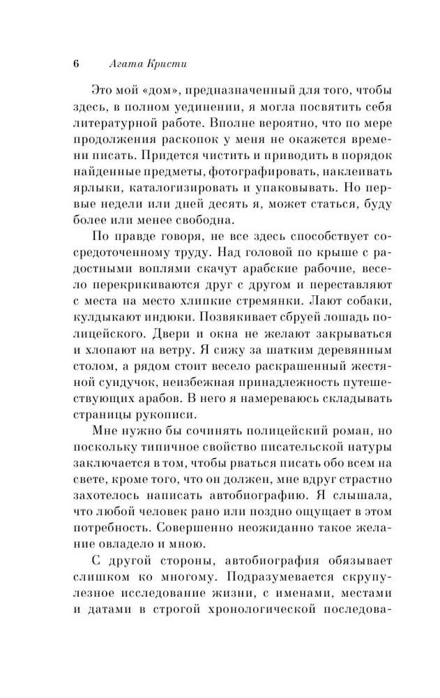 «Автобиография», над которой Агата Кристи работала полтора десятка лет, оказалась не менее увлекательной и популярной, чем ее детективы. Любителям мемуарной прозы и поклонникам таланта великой писательницы наверняка будет интересно узнать о том, как она готовилась стать оперной певицей и композитором, в годы Первой мировой войны трудилась сестрой милосердия, работала как фармацевт с экзотическими ядами и ездила на археологические раскопки в Египет, летала на только что изобретенном аэроплане, бесстрашно водила машину, обожала верховую езду и серфинг, даже совершила кругосветное путешествие.