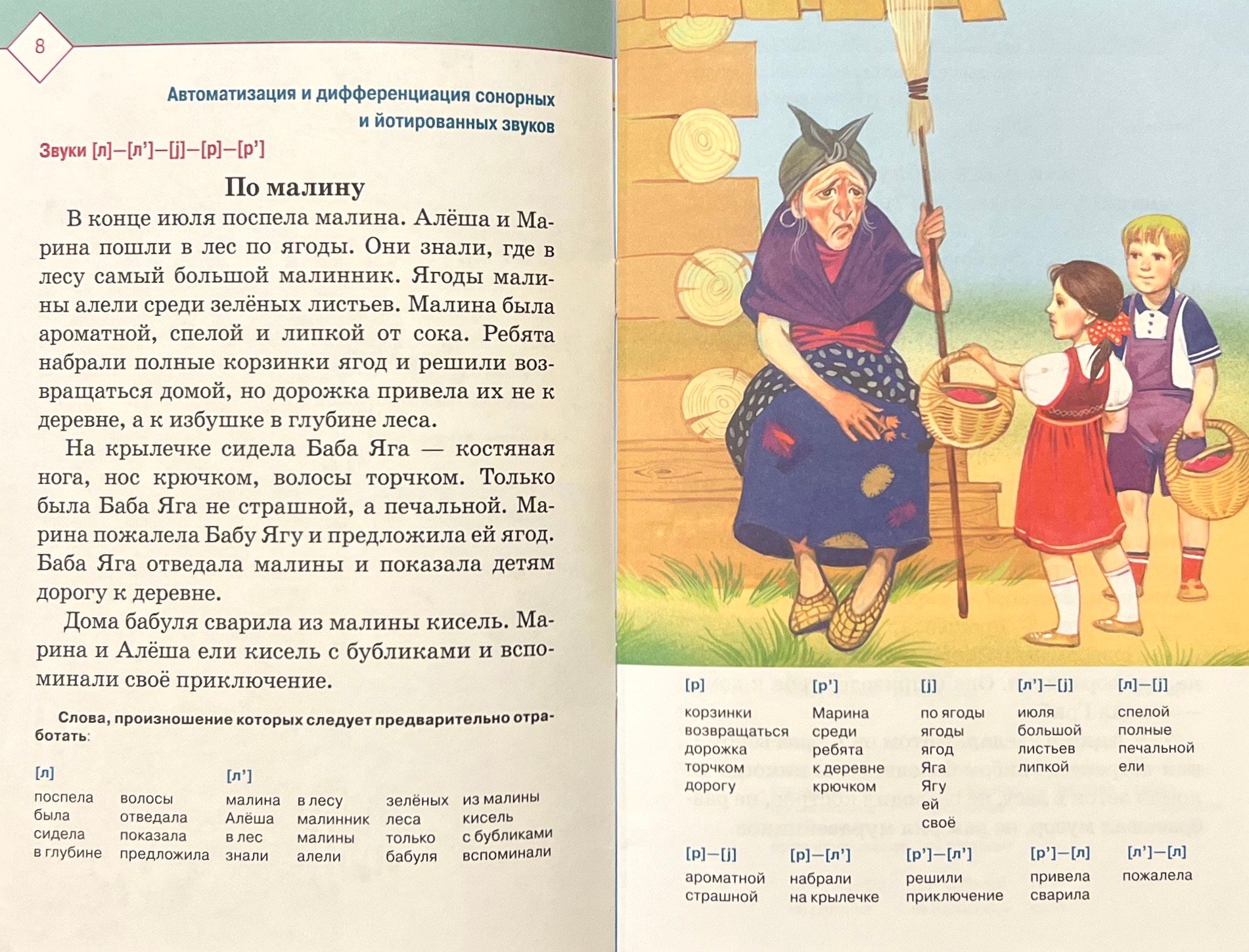 В пособии представлены картинки и тексты для автоматизации и дифференциации звуков [л], [л'], [р], [р'], [j]. Пособие позволяет по разному организовать работу с ребенком: повторять текст по одному предложению вслед за логопедом с опорой на картинку, предварительно отработав произношение слов, вынесенных за пределы текста, пересказывать текст с опорой на картинку или читать его, правильно произнося слова со сложными звуками. Адресовано учителям-логопедам детских дошкольных образовательных учреждений и школьных логопедических пунктов, воспитателям детских садов, родителям детей, имеющих проблемы речевого развития.