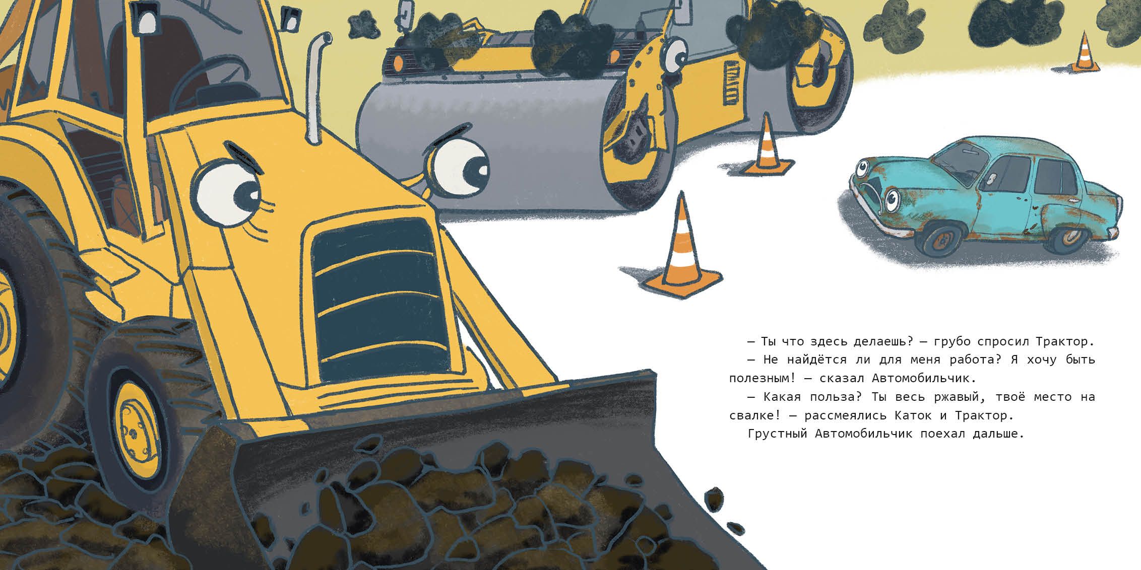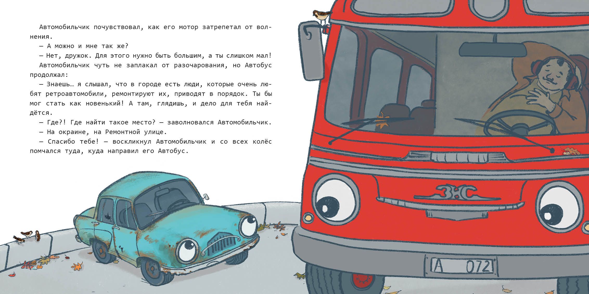 Старый Автомобильчик давно стоял во дворе без дела, хозяин про него совсем забыл. Автомобильчик скучал, но очень надеялся, что когда-нибудь снова сможет стать полезным. И однажды он всё-таки решил отправиться в путешествие. Автомобильчик долго колесил по городу, встретил множество разных машин и даже познакомился с большими кораблями! Однако новые автомобили только посмеивались над ним. Мечта найти себе дело таяла с каждым часом, но неожиданно Автомобильчик заметил большой старомодный Автобус…