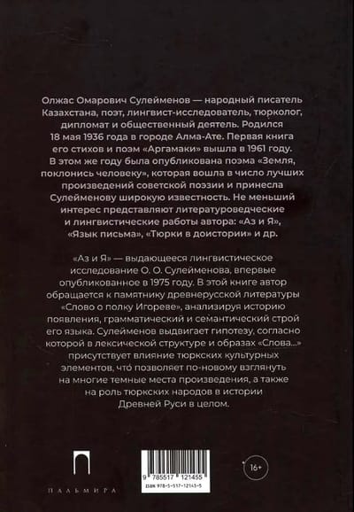 «Аз и Я» - выдающееся лингвистическое исследование казахского поэта, писателя и культуролога Олжаса Сулейменова, впервые опубликованное в 1975 году. В этой книге автор обращается к памятнику древнерусской литературы «Слово о полку Игореве», анализируя историю появления, грамматический и семантический строй его языка. Сулейменов выдвигает гипотезу, согласно которой в лексической структуре и образах «Слова...» присутствует влияние тюркских культурных элементов, что позволяет по-новому взглянуть на многие темные места произведения, а также на роль тюркских народов в истории Древней Руси в целом.