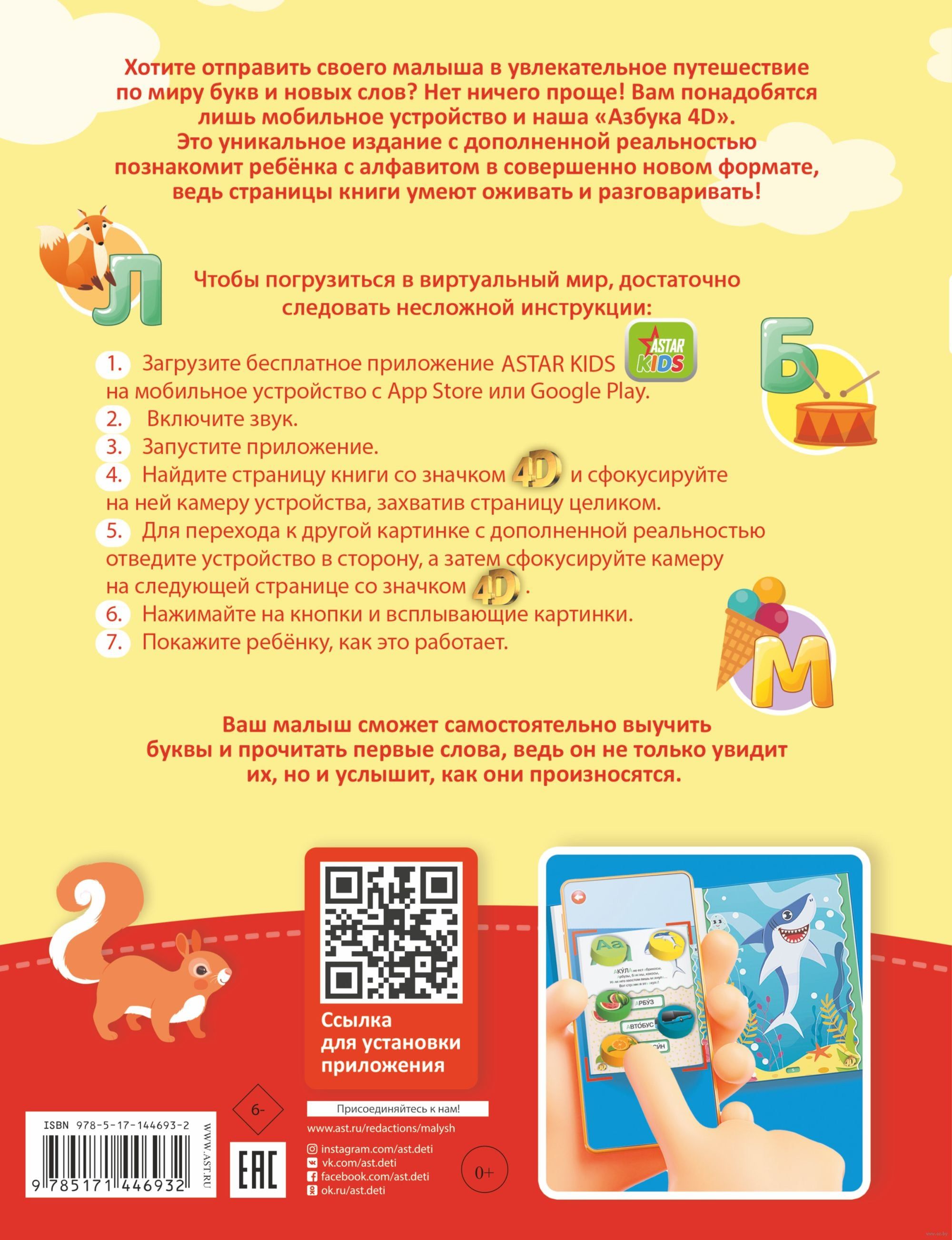 Ваш малыш ещё не умеет читать, но полон желания и решимости приступить к изучению букв? «Азбука 4D» спешит на помощь. Это уникальное издание отличается тем, что знакомство с алфавитом сопровождается дополненной реальностью. А это значит, что ребёнок сможет изучать книгу даже самостоятельно. Достаточно навести смартфон на страницу, нажать на предлагаемые картинки, и они оживут, будто в мультфильме. Кроме того, нажав на выбранную букву, малыш услышит, как она произносится, а также сможет выучить наизусть короткие весёлые стишки, сопровождающие каждую букву. Всё это делает книгу просто незаменимой для детей современных родителей, которые идут в ногу со временем.