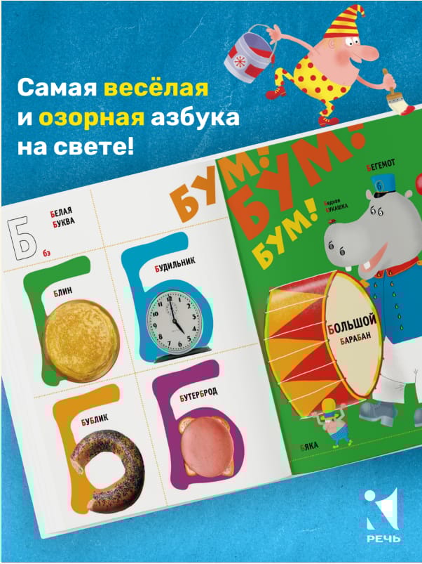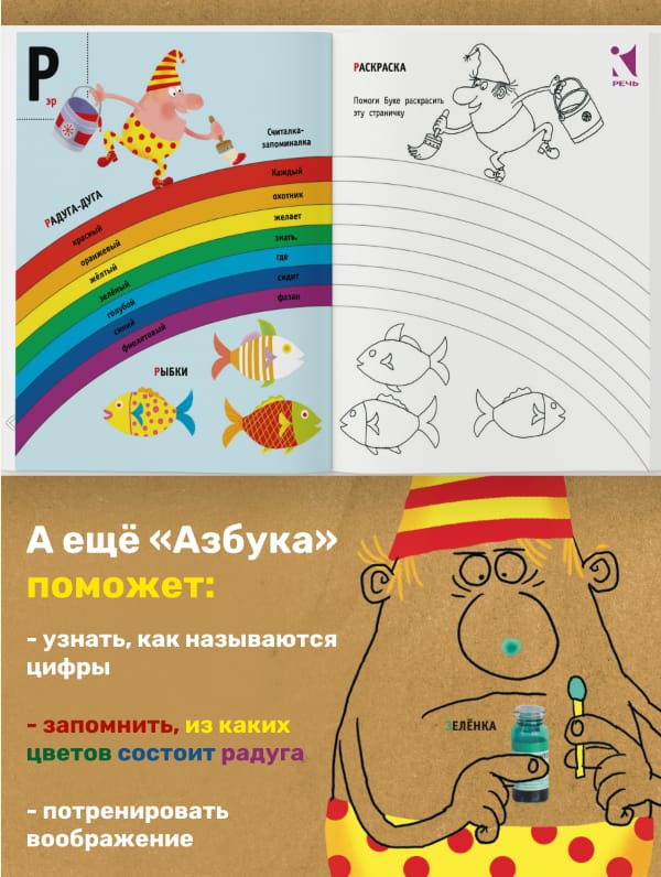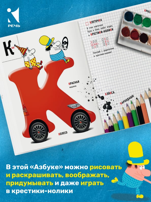 Каждому маленькому человеку нужна азбука, которая познакомит его со всеми буквами алфавита. Но что, если это знакомство превратить в забавную игру? Художник дядя Коля Воронцов придумал азбуку именно такой — не просто познавательной, а озорной и весёлой! В ней можно рисовать и раскрашивать, воображать, придумывать и даже играть в крестики-нолики. А справиться с познавательной частью малышам помогут герои Бука и Бяка, которые превращают каждый разворот в короткую занимательную историю. С ними не только не соскучишься, но ещё и сможешь узнать целую гору полезных вещей: например, как называются цифры и как запомнить, из каких цветов состоит радуга. Такой азбуки, как эта, вы точно ещё не встречали!