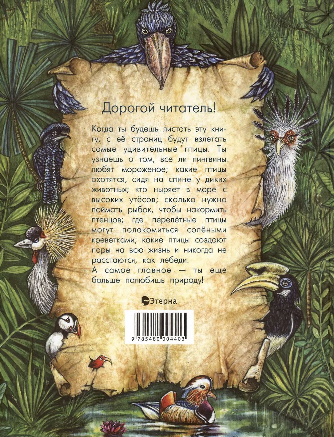 Во второй части любознательный читатель найдет «Уроки орнитологии», краткую справку о птицах - героях книги: где они обитают, чем питаются, как знакомятся для создания семьи и как родители заботятся о своих желторотых птенцах.