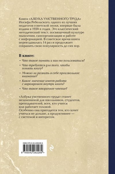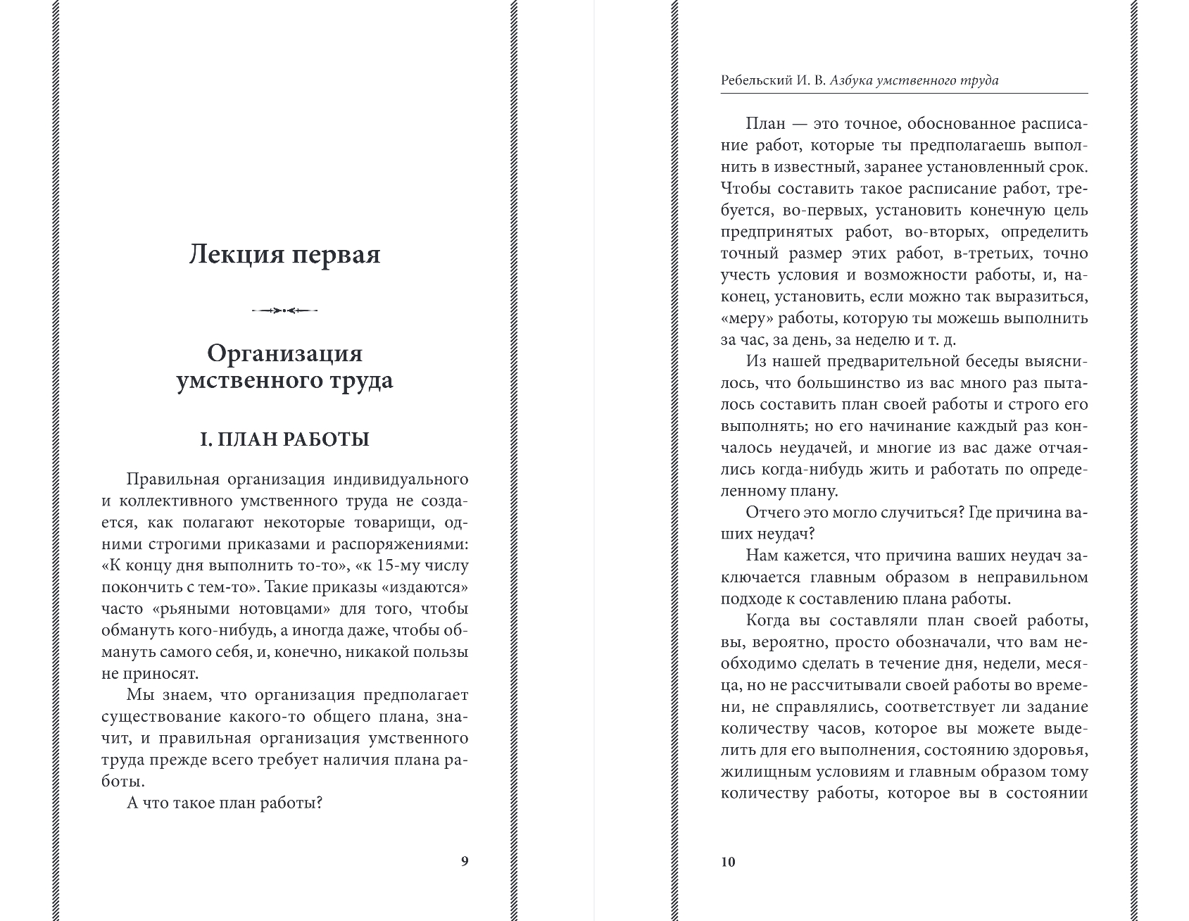 И. Ребельский учит, как организовать свой умственный труд: от ведения конспектов до эффективного чтения и борьбы с усталостью. Автор рассказывает простыми словами — о памяти, внимании, логике, конспектах, чтении и умении учиться. Эта книга станет незаменимой для школьников, студентов, преподавателей, всех, кто учится или работает головой.