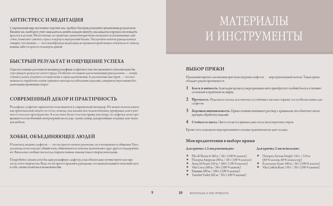 - практические советы по выбору пряжи, крючков и блокировке и уходу за готовыми изделиями.