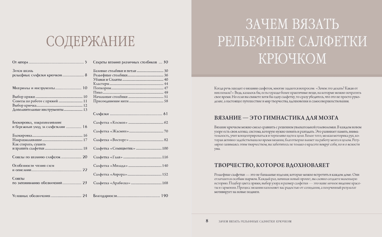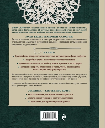 «Занимаясь ажурным вязанием, вы заботитесь не только о красоте вокруг себя, но и о ясности своего ума», — так считает Елена Скрипина — мастер вязания крючком с более чем 35-летним опытом, чьи книги об ажурных рельефных салфетках стали настольными у многих современных вязальщиц. Ее новые работы всегда ждут с нетерпением — и эта книга не исключение.