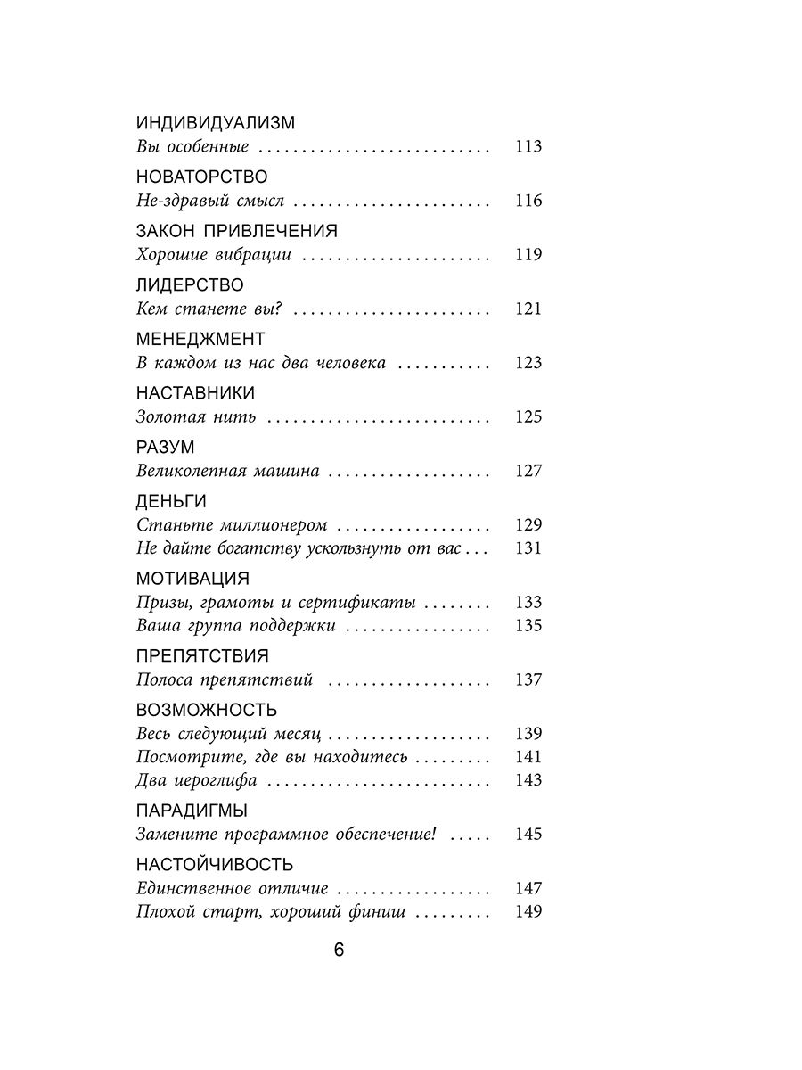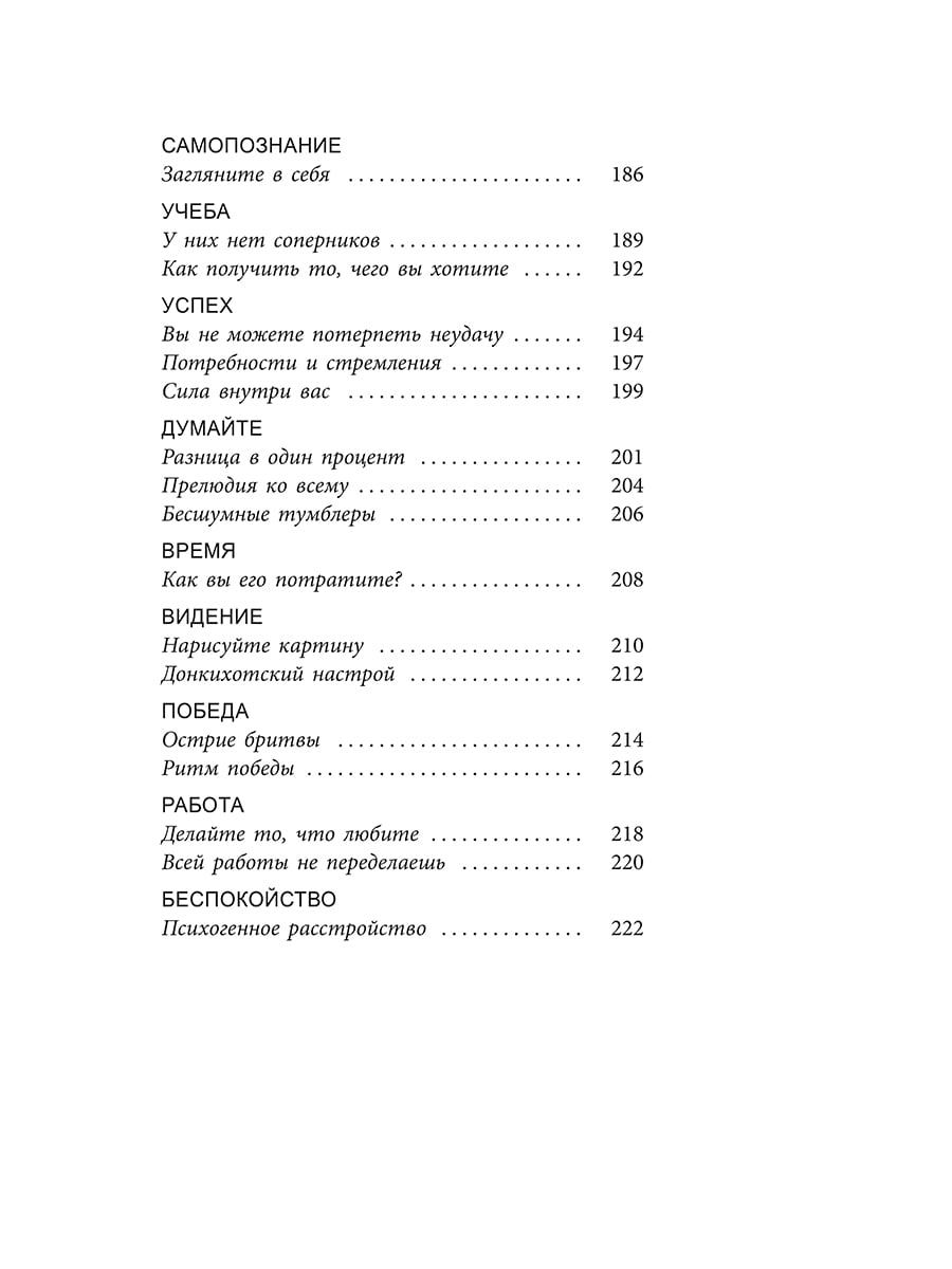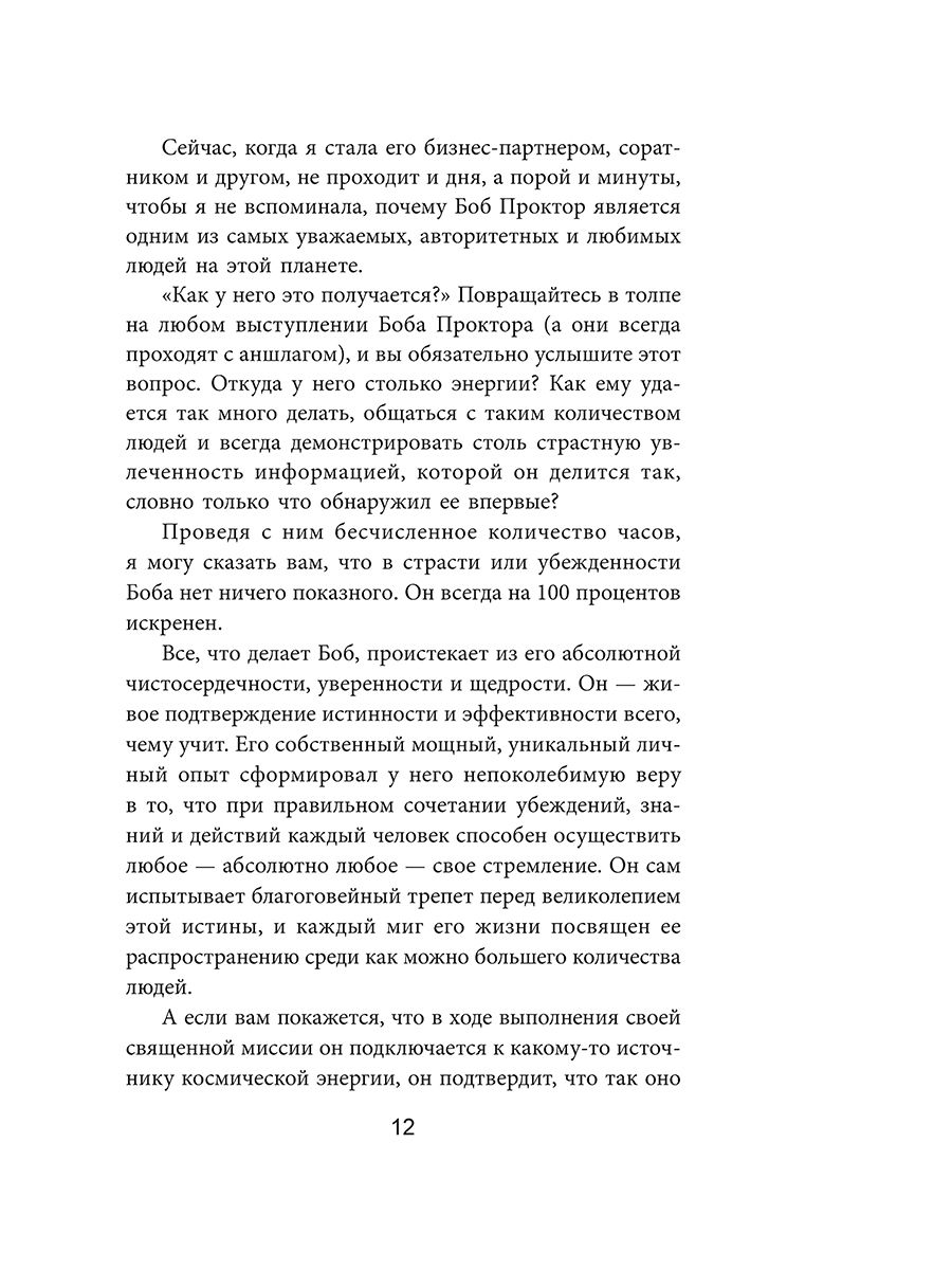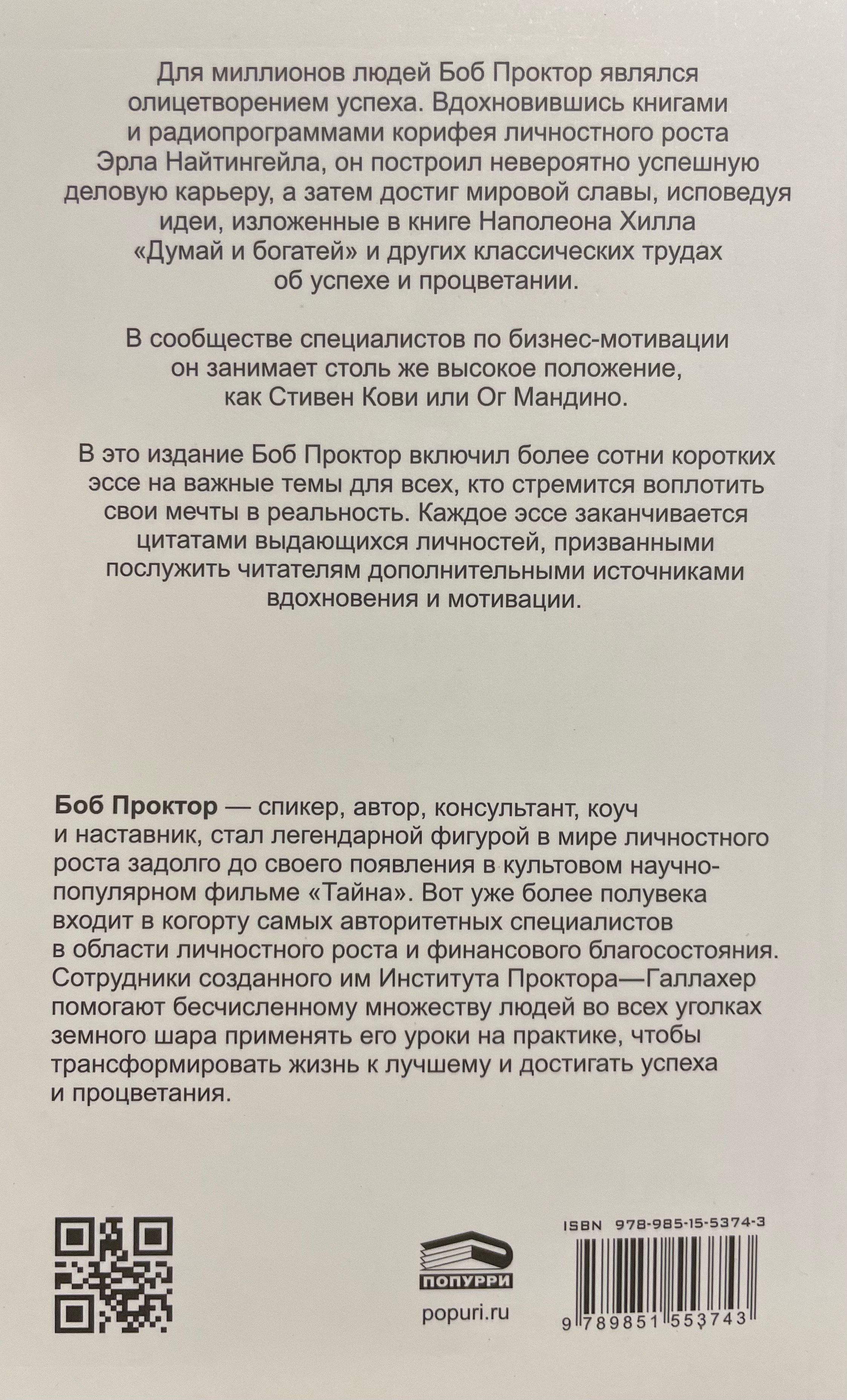 Компактное, но чрезвычайно информативное руководство по принципам успеха от одного из самых авторитетных мотивационных спикеров в мире. Для миллионов людей Боб Проктор являлся олицетворением успеха. Вдохновившись книгами и радиопрограммами корифея личностного роста Эрла Найтингейла, он построил невероятно успешную деловую карьеру, а затем достиг мировой славы, исповедуя идеи, изложенные в книге Наполеона Хилла «Думай и богатей» и других классических трудах об успехе и процветании. В сообществе специалистов по бизнес-мотивации он занимает столь же высокое положение, как Стивен Кови или Ог Мандино. В это издание Боб Проктор включил более сотни коротких эссе на важные темы для всех, кто стремится воплотить свои мечты в реальность. Каждое эссе заканчивается цитатами выдающихся личностей, призванными послужить читателям дополнительными источниками вдохновения и мотивации.