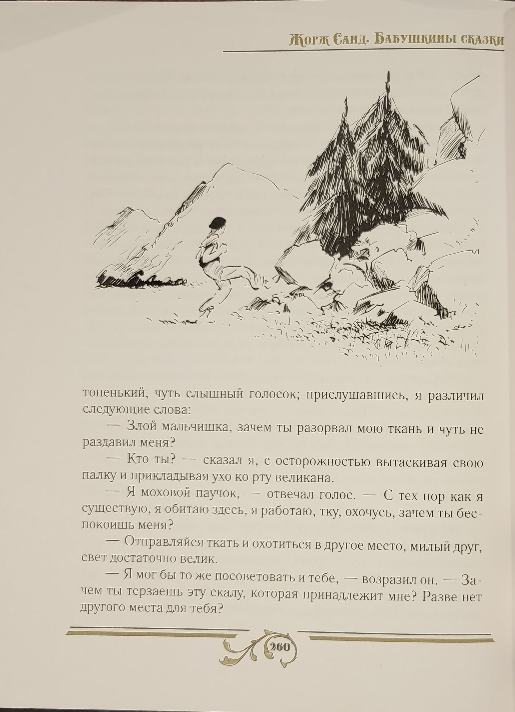 Жорж Санд — псевдоним французской писательницы Авроры Дюпен (1804–1876), под которым она вошла в историю классической литературы для взрослых читателей. Однако у нее есть замечательные произведения, адресованные и юным читателям, — сказки, которые она сочиняла для своих любимых внучек Авроры и Габриэлы и получивших название «Бабушкины сказки». «Полагаю, что чудеса в природе бывают, иначе я не могла бы тебе рассказывать о них, — писала она, предваряя одну из очередных своих историй. — Остается узнать, где находятся существа, называемые сверхъестественными…» На страницах этих историй читателям и предстоит узнать, где обитают эти существа, соприкоснуться со всем, чему полагается быть в сказках: с добром и злом, феями и духами, чудесами и превращениями. Но эти сказки призваны не только развлекать, они обучают, развивают вступающего в большой и непознанный мир маленького человека, заставляя его задуматься о происхождении многих явлений, воспитывая в нем доброту, нравственность, бескорыстие, любовь к людям. А философский уклон и необычные сюжеты сказок делают их интересными и для взрослых. В первый том собрания вошли сказки: «Замок Пиктордю», «Крылья мужества», «Необыкновенный оргaн» и «Великан Иеус», иллюстрированные работами французских и русских художников. Во второй том собрания вошли сказки: «Говорящий дуб», «Что говорят цветы», «Королева Квакуша», «Розовое облако», «Красный молоток», «Фея пыли», «Собака и священный цветок», «Пучеглазая фея», «Грибуль», иллюстрированные работами французских и русских художников.