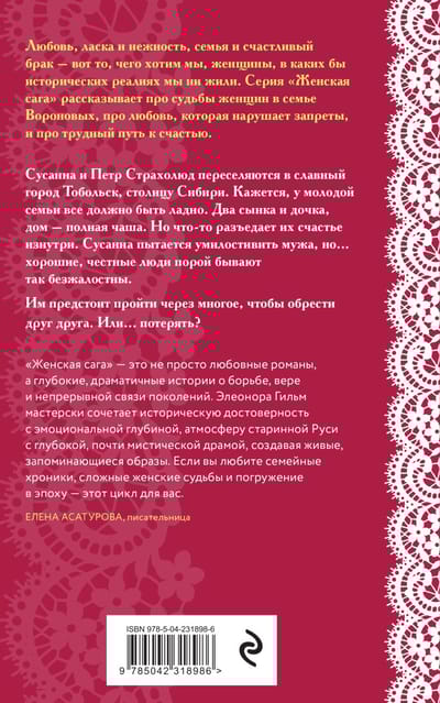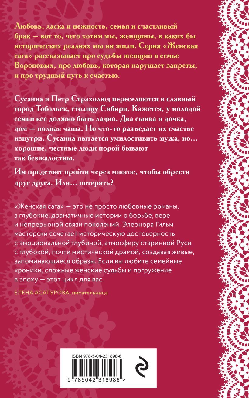 С циклом «Женская сага» история оживает и становится реальностью! Вы ощутите, каково это: оказаться в России XVI—XVII века, косить траву, прясть при свете лучины, думать о грехе и страшиться расплаты. Задумаетесь, как непросто жить без электричества и медицины. Вдохнете запахи колдовских трав и закутаетесь в невероятную сагу Элеоноры Гильм, как в душегрею.