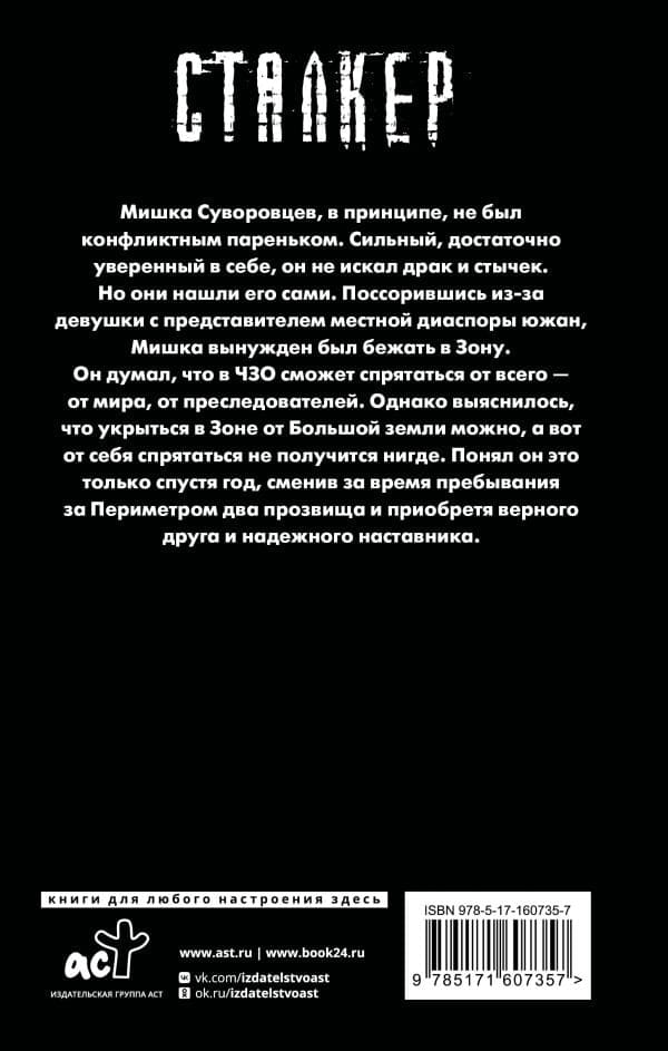 Мишка Суворовцев, в принципе, не был конфликтным пареньком. Сильный, достаточно уверенный в себе, он не искал драк и стычек. Но они нашли его сами. Поссорившись из-за девушки с представителем местной диаспоры южан, Мишка вынужден был бежать в Зону. Он думал, что в ЧЗО сможет спрятаться от всего — от мира, от преследователей. Однако выяснилось, что укрыться в Зоне от Большой земли можно, а вот от себя спрятаться не получится нигде. Понял он это только спустя год, сменив за время пребывания за Периметром два прозвища и приобретя верного друга и надежного наставника.