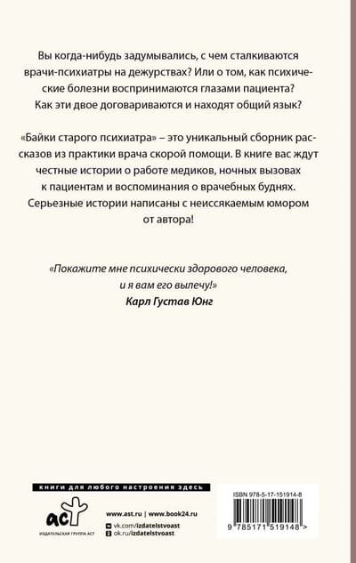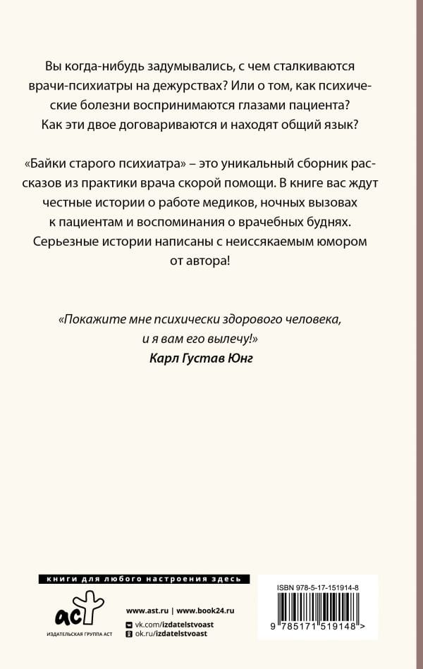 Вы когда нибудь задумывались, с чем сталкиваются врачи психиатры на дежурствах? Или о том, как психические болезни воспринимаются глазами пациента? Как эти двое договариваются и находят общий язык? «Байки старого психиатра» — это уникальный сборник рассказов из практики врача скорой помощи. В книге вас ждут честные истории о работе медиков, ночных вызовах к пациентам и воспоминания о врачебных буднях. Серьезные истории написаны с неиссякаемым юмором от автора!