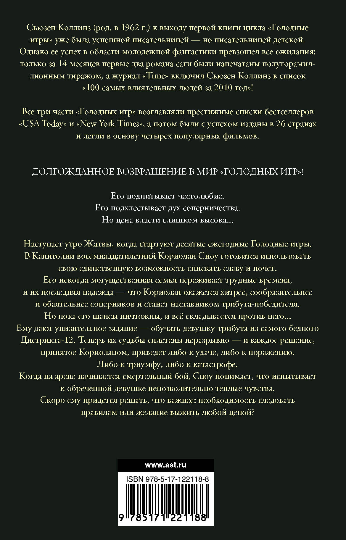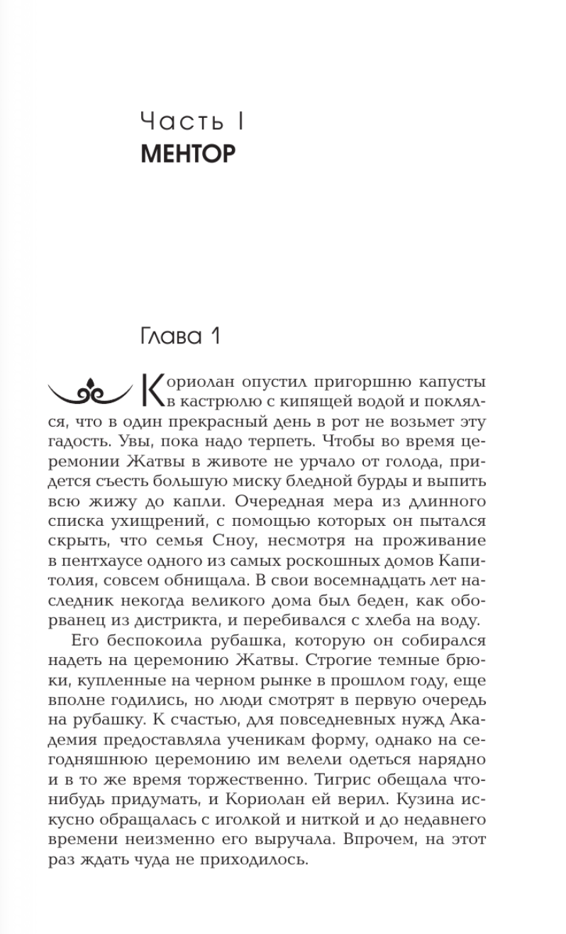 Наступает утро Жатвы, когда стартуют десятые ежегодные Голодные игры. В Капитолии восемнадцатилетний Кориолан Сноу готовится использовать свою единственную возможность снискать славу и почет. Его некогда могущественная семья переживает трудные времена, и их последняя надежда — что Кориолан окажется хитрее, сообразительнее и обаятельнее соперников и станет наставником трибута-победителя. Но пока его шансы ничтожны, и всё складывается против него... Ему дают унизительное задание — обучать девушку-трибута из самого бедного Дистрикта-12. Теперь их судьбы сплетены неразрывно — и каждое решение, принятое Кориоланом, приведет либо к удаче, либо к поражению. Либо к триумфу, либо к катастрофе. Когда на арене начинается смертельный бой, Сноу понимает, что испытывает к обреченной девушке непозволительно теплые чувства.