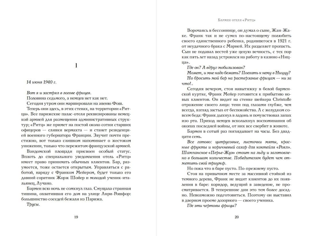 Июнь 1940 года. Немцы входят в Париж. Везде действует строгий комендантский час, за исключением гранд отеля Ритц. Жаждущие познакомиться с искусством жить по-французски, обитатели отеля встречаются с парижской элитой, а за барной стойкой работает Франк Мейер, крупнейший бармен в мире.