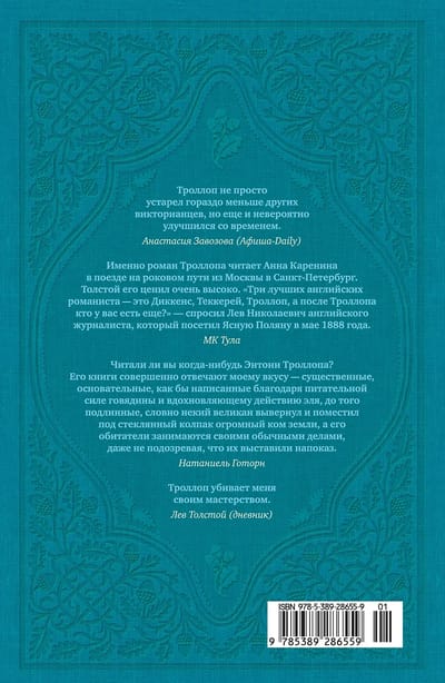 Энтони Троллоп — британский классик, современная популярность которого в англоязычном мире может сравниться разве что со славой Джейн Остин («Троллоп убивает меня своим мастерством», — писал в своем дневнике Лев Толстой), а «Барсетширские хроники» заслуженно считаются едва ли не главным его достижением.