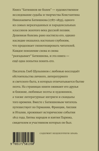 Книга «Батюшков не болен» — художественное исследование судьбы и творчества Константина Николаевича Батюшкова (1787–1855), одного из самых неразгаданных и парадоксальных классиков золотого века русской поэзии. Душевная болезнь рано настигла его, однако наследие оказалось настолько глубоким, что продолжает гипнотизировать читателей. Каждое поколение снова и снова «разгадывает» Батюшкова, и эта книга — еще одна попытка понять его.