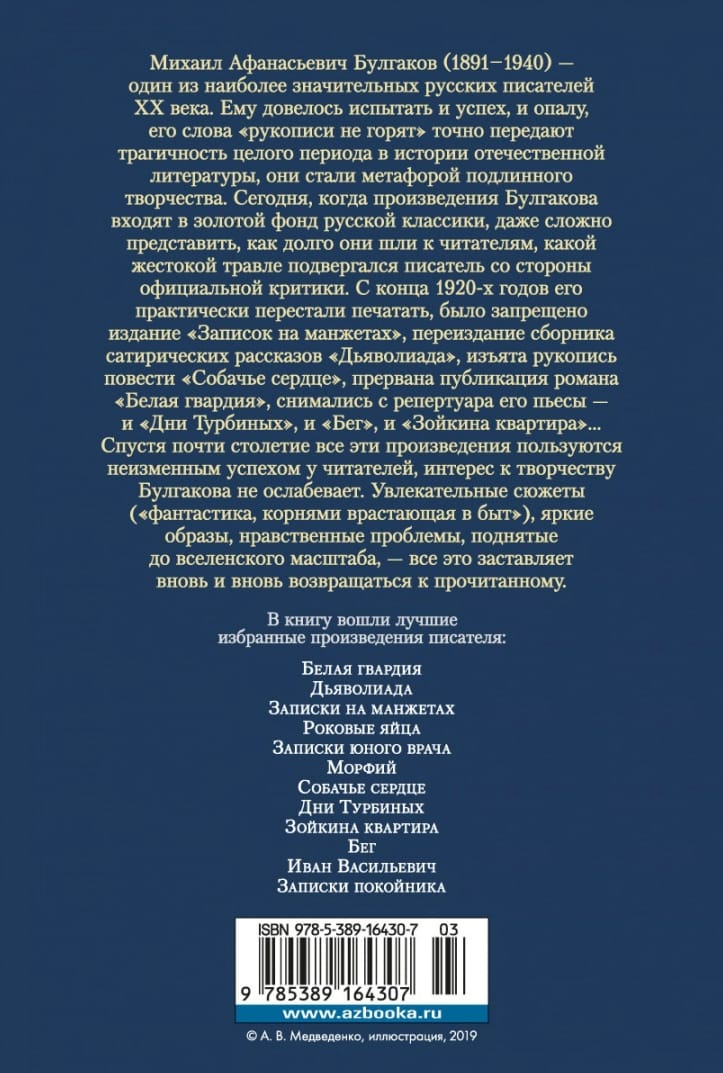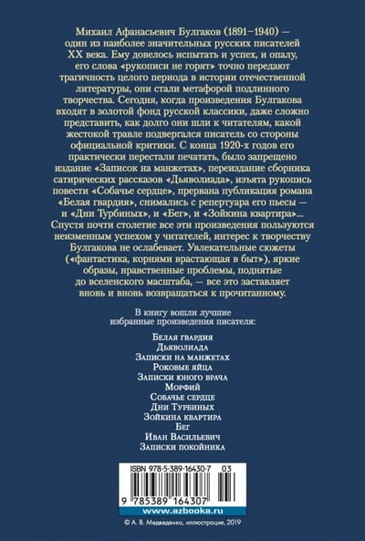 Михаил Афанасьевич Булгаков (1891-1940) - один из наиболее значительных русских писателей ХХ века. Ему довелось испытать и успех, и опалу, его слова «рукописи не горят» точно передают трагичность целого периода в истории отечественной литературы, они стали метафорой подлинного творчества. Сегодня, когда произведения Булгакова входят в золотой фонд русской классики, даже сложно представить, как долго они шли к читателям, какой жестокой травле подвергался писатель со стороны официальной критики. С конца 1920-х годов его практически перестали печатать, было запрещено издание «Записок на манжетах», переиздание сборника сатирических рассказов «Дьяволиада», изъята рукопись повести «Собачье сердце», прервана публикация романа «Белая гвардия», снимались с репертуара его пьесы - и «Дни Турбиных», и «Бег», и «Зойкина квартира»... Спустя почти столетие все эти произведения пользуются неизменным успехом у читателей, интерес к творчеству Булгакова не ослабевает. Увлекательные сюжеты («фантастика, корнями врастающая в быт»), яркие образы, нравственные проблемы, поднятые до вселенского масштаба, - все это заставляет вновь и вновь возвращаться к прочитанному.