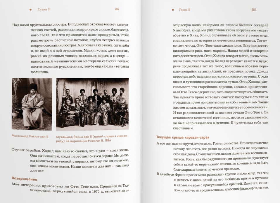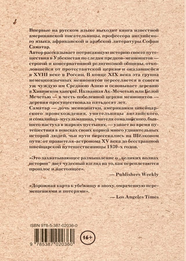 Спустя много лет успешная писательница, профессор английского языка, африканской и арабской литературы София Саматар получит в подарок книгу «Великое переселение российских меннонитов в Среднюю Азию, 1880–1884» (меннонитство возникло в XVI веке в результате реформации церкви в Европе; меннониты вынуждены были эмигрировать, в том числе и в Россию), и ей откроется невероятная история, о которой она ничего не знала. И вот уже она отправляется в путешествие в Узбекистан, через Ташкент, Самарканд и Хиву, повторяя путь, который в конце XIX века проделали ее предки-единоверцы. История переселения этих религиозных изгнанников в Среднюю Азию, то, как они искренне верили, что Спаситель придет именно в то самое поселение, куда они направились, то, что мусульмане-узбеки выделили им маленькую белую мечеть, чтобы христианам-меннонитам было где молиться, а затем меннониты и сами построили свой храм, который местные прозвали «белой мечетью» — все это так же необычно, как и происхождение самой Софии. Возможно, поэтому она и решилась на эту авантюру, проехав ради нее полмира.