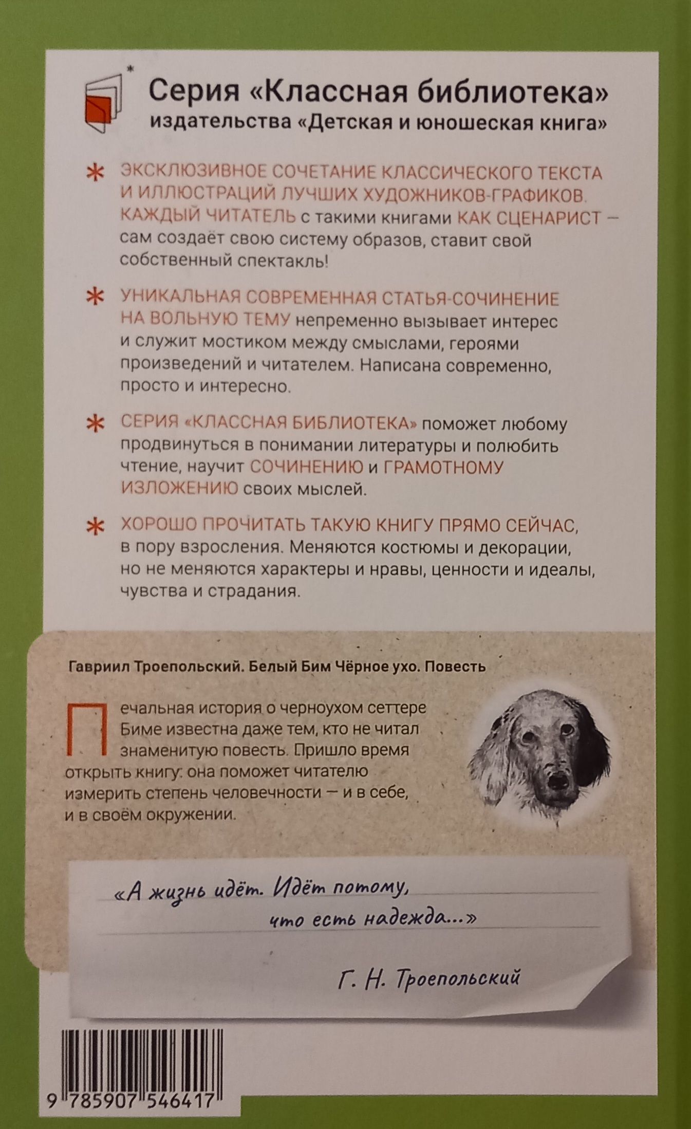 Трогательная лирическая повесть об умной охотничьей собаке стала знаковой в творчестве замечательного писателя Гавриила Николаевича Троепольского (1905—1995). Хозяину Бима неожиданно пришлось лечь в больницу, и собака оказалась на улице. В большом мире пёс встречает много людей, хороших и плохих, добрых и злых. Он проходит множество испытаний, но встретиться с хозяином ему так и не довелось… Эта история не просто об отношении человека к животным, эта история о преданности, дружбе и предательстве, о сострадании и жестокости, о подлости и благородстве. Для среднего и старшего школьного возраста.