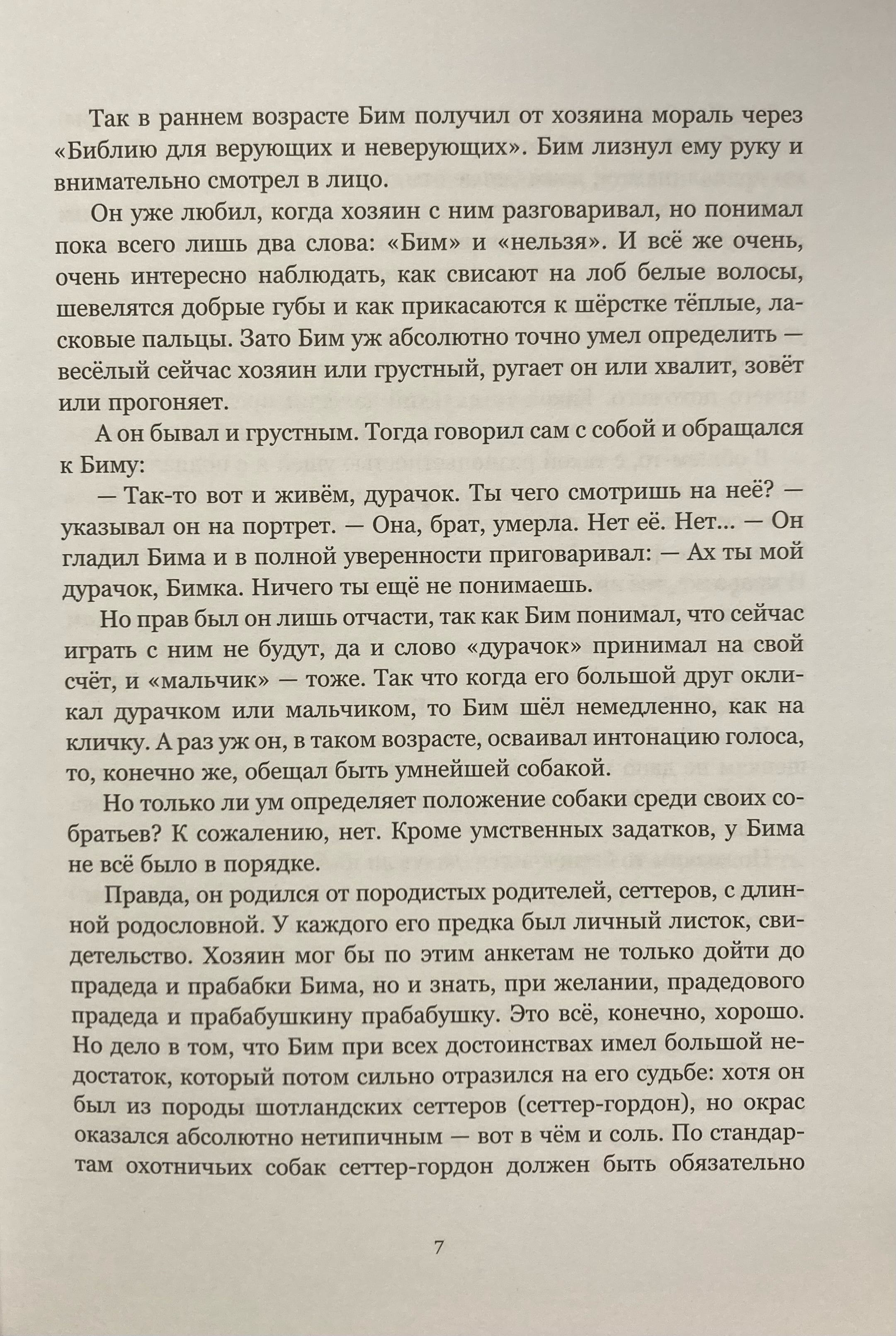 Пронзительная история о сострадании и жестокости, о дружбе и предательстве и о той безграничной преданности, на которую способен далеко не каждый человек и которая вела шотландского сеттера Бима вслед за хозяином до тех пор, пока Бим был способен идти. Повесть, давшая нам возможность взглянуть на окружающий мир глазами собаки, была удостоена Государственной премии СССР и уже несколько десятилетий не оставляет равнодушными ни маленьких, ни взрослых читателей.