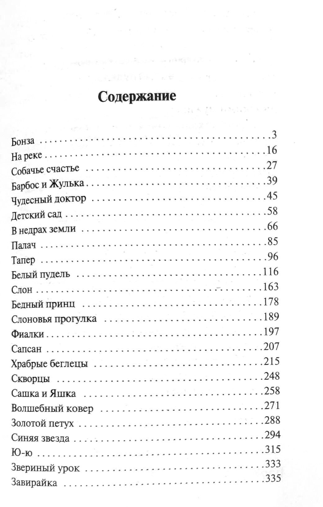 «Белый пудель», «Чудесный доктор», «Тапер», «Слон», «Детский сад», «Барбос и Жулька», «Фиалки», «Сапсан» и многие другие произведения открывают для нас добрый и отзывчивый мир, в котором есть и ночная ловля раков, и невероятная дружба дворового пса Барбоса и комнатной Жульки, и бродячая труппа с артистичным белым пуделем Арто…