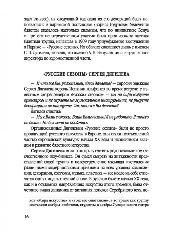 Он был очаровательным и несносным, сентиментальным и вспыльчивым, всеобщим любимцем и в то же время очень одиноким человеком. Сергей Дягилев - человек-загадка даже для его современников. Почему-то одни видели в нем выскочку и прохвоста, а другие - «крестоносца красоты». Он вел роскошный образ жизни, зная, что вызывает интерес общественности. После своей смерти не оставил ни гроша, даже похороны его оплатили спонсоры. Дягилев называл себя «меценатом европейского толка», прорубившим для России «культурное окно в Европу». Именно он познакомил мир с глобальной, непреходящей ценностью российской культуры. Сергея Дягилева можно по праву считать родоначальником отечественного шоу-бизнеса. Он сумел сыграть на эпатажности представлений своей труппы и целеустремленно насыщал выступления различными модернистскими приемами на всех уровнях композиции: декорации, костюмы, музыка, пластика - все несло на себе отпечаток самых модных веяний эпохи. «Русские сезоны» подняли европейское искусство на качественно новый уровень развития и по сей день не перестают вдохновлять творческую богему на поиски новых идей. Зарубежные ценители искусства по сей день склоняют голову перед памятью Сергея Павловича Дягилева, обогатившего Запад достижениями русской культуры.