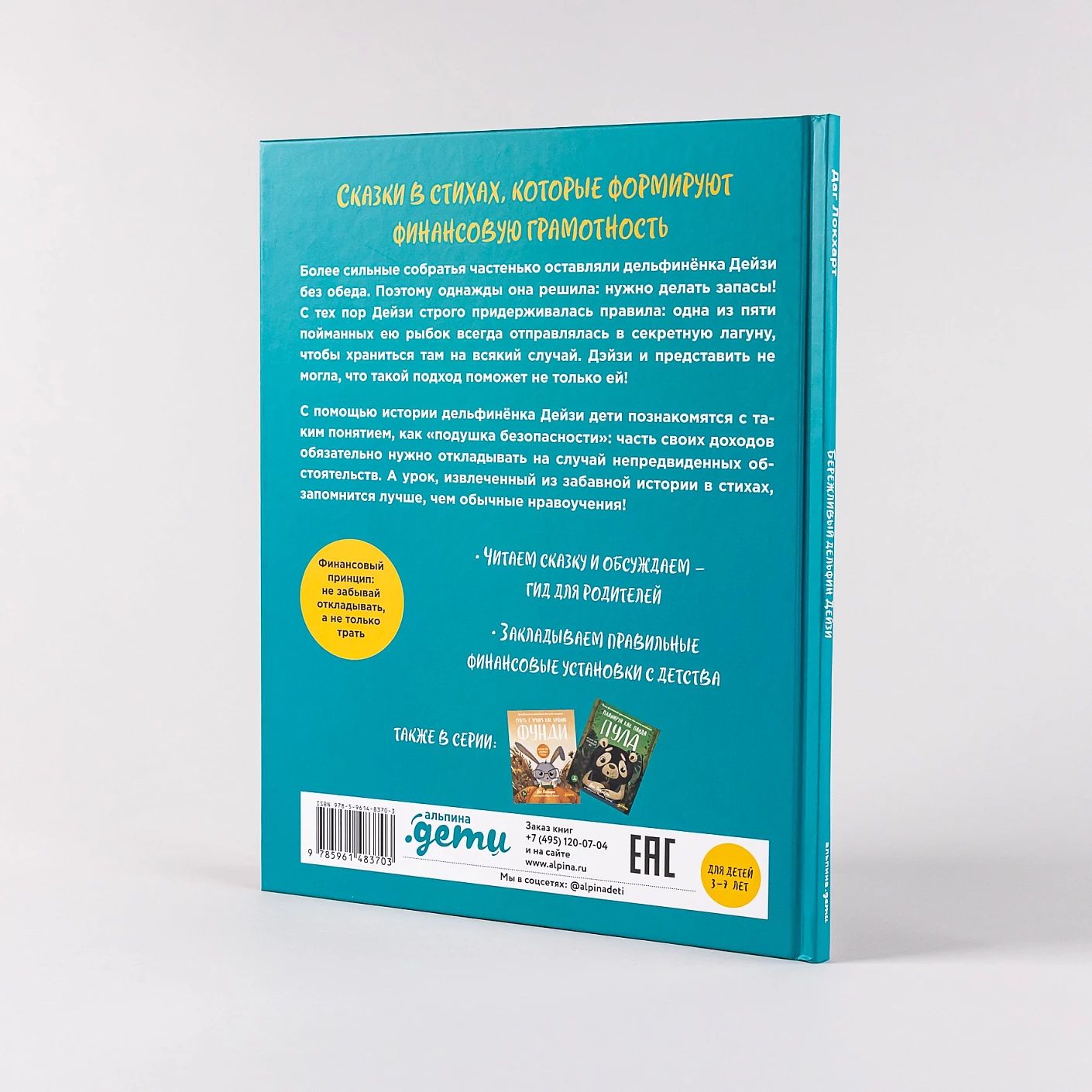 Серия «Уроки финансовой грамотности для самых маленьких» — это три сказки в стихах, в каждой из которых рассматривается один важный финансовый урок. В этой книге главный герой — маленький дельфинёнок Дейзи. Более сильные собратья частенько оставляли Дейзи без обеда. Поэтому однажды она решила — нужно делать запасы. С тех пор Дейзи строго придерживалась правила: одна из пяти пойманных ею рыбок всегда отправлялись в секретную лагуну, чтобы храниться там на всякий случай. Дейзи и представить не могла, что такой подход поможет не только ей.