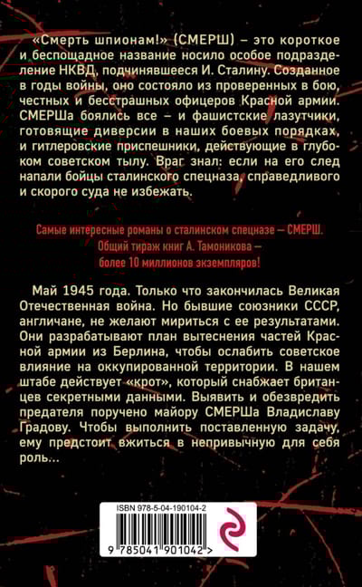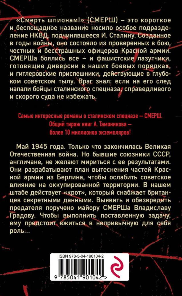«Смерть шпионам!» (СМЕРШ) — это короткое и беспощадное название носило особое подразделение НКВД, подчинявшееся И. Сталину. Созданное в годы войны, оно состояло из проверенных в бою, честных и бесстрашных офицеров Красной Армии. СМЕРШа боялись все — и фашистские лазутчики, готовящие диверсии в наших боевых порядках, и гитлеровские приспешники, действующие в глубоком советском тылу. Враг знал: если на его след напали бойцы сталинского спецназа, справедливого и скорого суда не избежать.