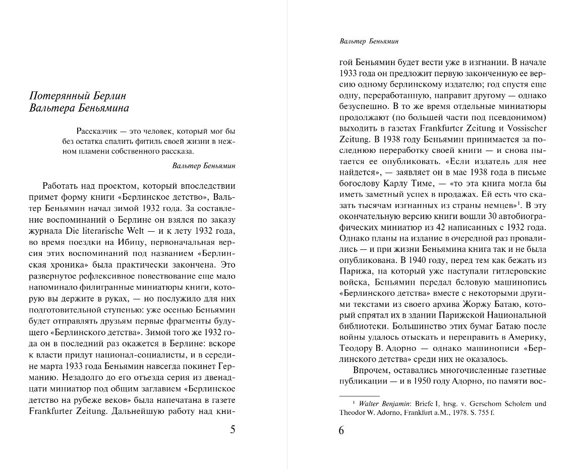 Воспоминания о катании на коньках, коллекции открыток, запах рождественской елки и шелест книг, которые окружали его с самого детства, — все эти крошечные фрагменты детства Вальтер Беньямин с любовью описывает, окутывая читателя магией своих причудливых, поэтичных метафор.