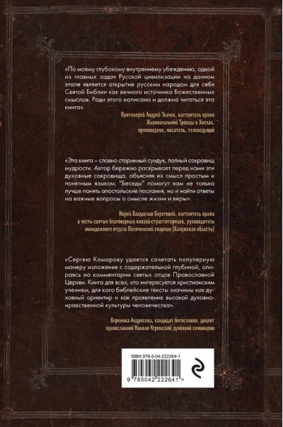Великолепное современное толкование на Соборные послания. Семь посланий Нового Завета, именуемых «соборные» — послание апостола Иакова, два послания апостола Петра, три послания апостола Иоанна, послание Иуды, — являются неотъемлемой частью Библии. Они оказали значительное влияние на развитие христианского богословия. Однако эти тексты, ежедневно по зачалам читаемые в Церкви, остаются малопонятными даже для воцерковленных христиан. Книга Сергея Комарова на высоком уровне говорит об особенностях каждого из семи соборных посланий, раскрывает их богословскую и нравственную проблематику и находит в них темы, актуальные для современных людей. Она написана живым и доступным языком, понятным для широкой читательской аудитории. Сергею Комарову удается сочетать популярную манеру изложения с содержательной глубиной, в том числе благодаря обращению к толкованиям святых отцов Православной Церкви.