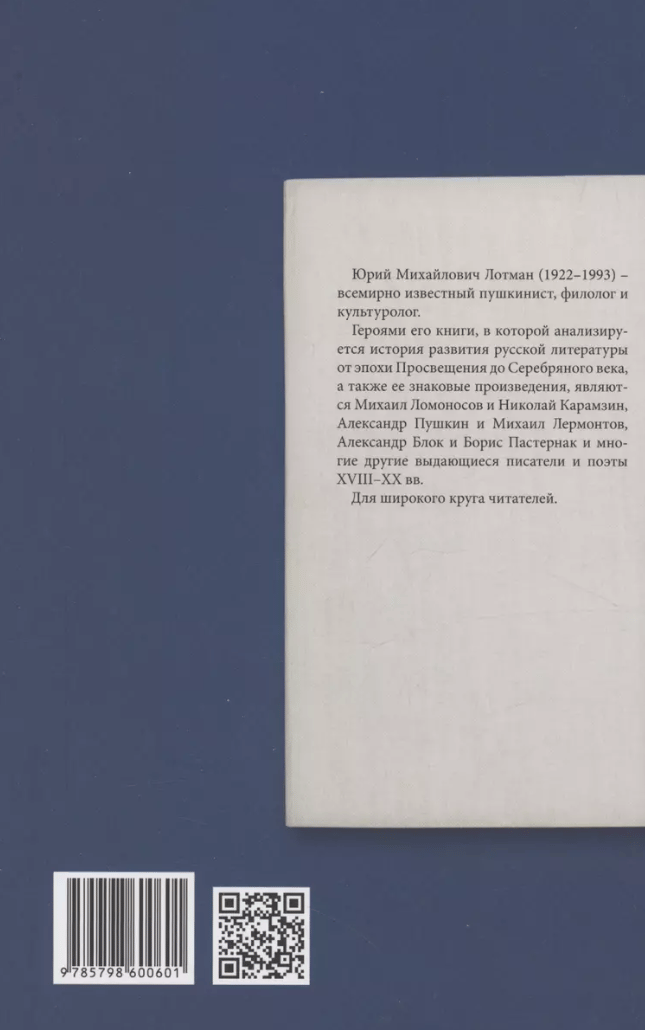 Юрий Михайлович Лотман (1922–1993) — всемирно известный пушкинист, филолог и культуролог. Героями его книги, в которой анализируется история развития русской литературы от эпохи Просвещения до Серебряного века, а также ее знаковые произведения, являются Михаил Ломоносов и Николай Карамзин, Александр Пушкин и Михаил Лермонтов, Александр Блок и Борис Пастернак и многие другие выдающиеся писатели и поэты XVIII–XX вв. Для широкого круга читателей.