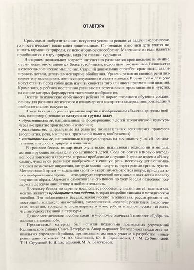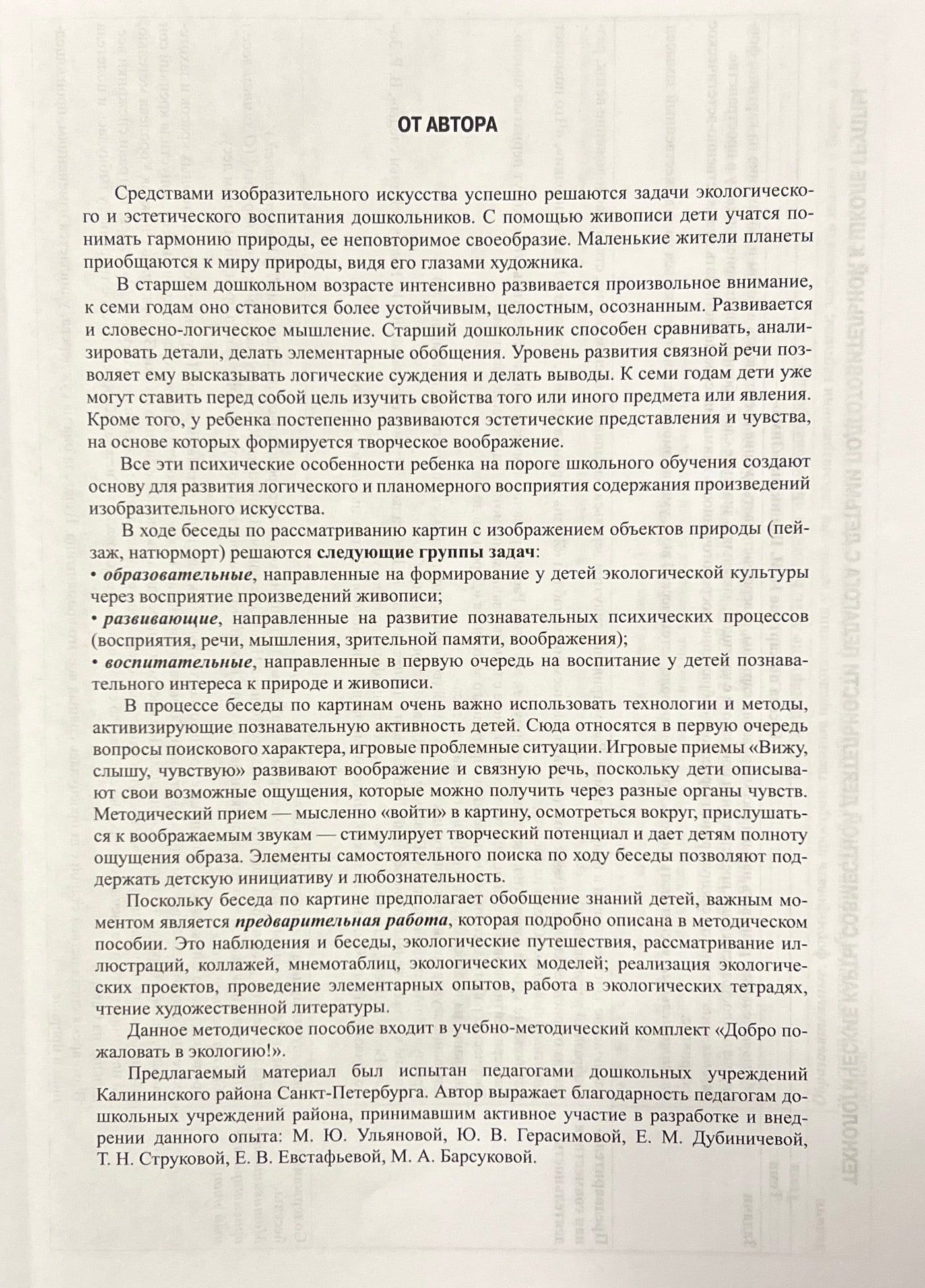 В пособии представлены конспекты развивающих бесед с детьми старшего дошкольного возраста, основанные на рассматривании и обсуждении репродукций картин известных русских художников. Это не только поможет приобщить детей к прекрасному миру русской живописи, но и будет способствовать решению задач эстетического и экологического воспитания. В ходе бесед по картинам можно добиться развития внимания, способности логически мыслить и делать выводы, связной аргументированной речи, зрительной памяти. Все это поможет старшему дошкольнику успешно подготовиться к обучению в начальной школе.