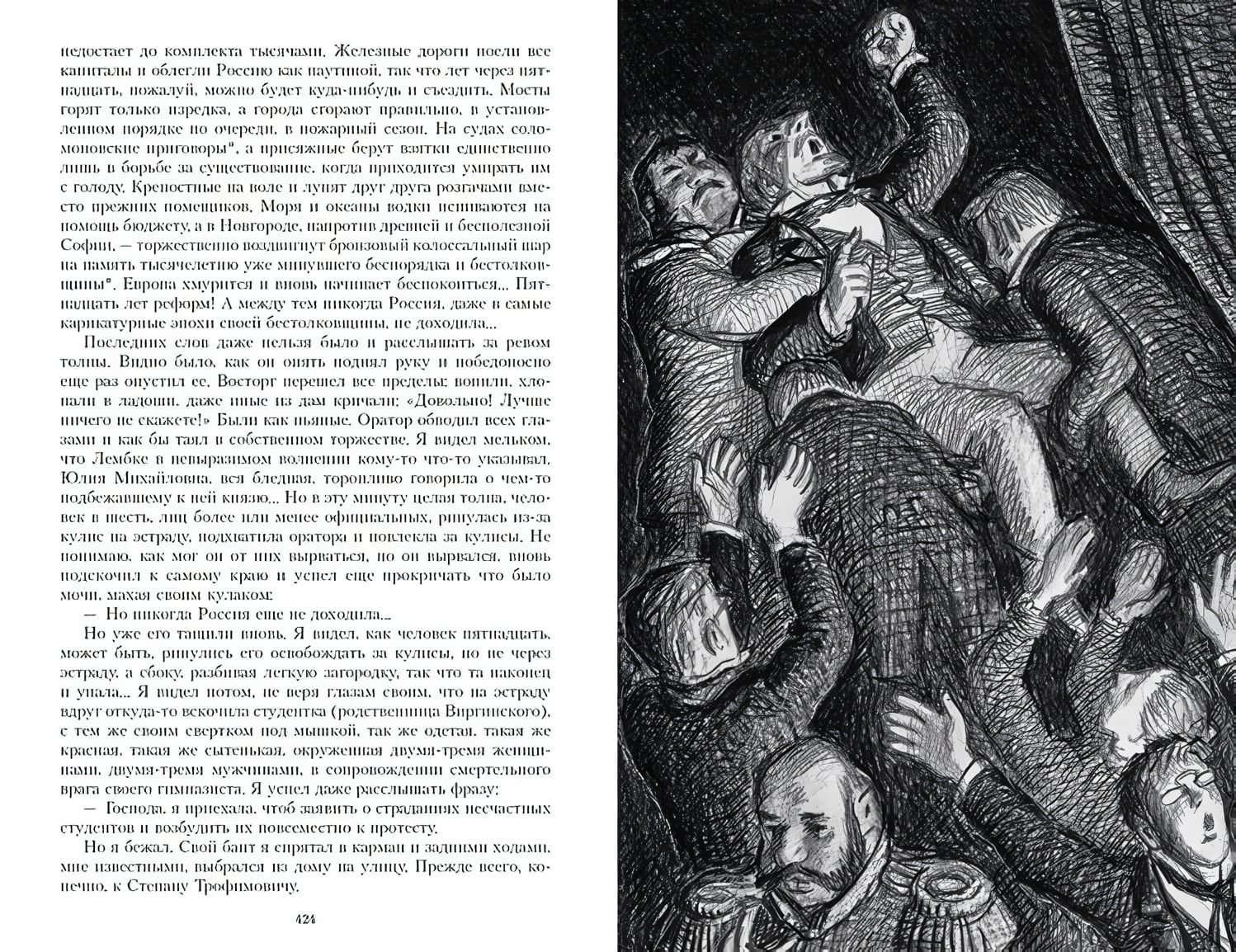 «Одно отрицание, без всякого великодушия и безо всякой силы», — произносит главный герой романа Николай Ставрогин и, по сути, описывает политические брожения в России 1870-х годов. Достоевским были уже написаны «Идиот», «Преступление и наказание» и «Игрок», он готовился приняться за главную книгу своей жизни. Но в это время в Петербурге бурно развивается революционное террористическое движение, результатом чего становится убийство студента, организованное предводителем партии «Народная расправа» Сергеем Нечаевым. Осмысление абсурдности и жестокости подобных форм борьбы заставило Достоевского отложить начатое и приняться за «Бесов». Сегодня, когда роман актуален не менее, чем 150 лет назад, нельзя сомневаться, что Достоевский написал великую книгу.