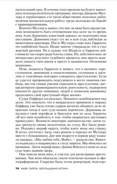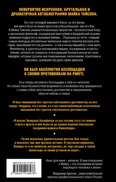 Невероятно искренняя, брутальная и драматичная автобиография Майка Тайсона. Он стал легендой мирового бокса, но его жизнь вне ринга была не менее яростной и бесшабашной, чем его бои. В Майке Тайсоне уживаются несколько личностей — безжалостный боец и ироничный философ, осужденный преступник и бродвейский шоумен, ранимый подросток и неуемный бабник… Парнишка из гетто, ставший самым молодым абсолютным чемпионом мира в тяжелой весовой категории, принявший это как должное — и так и не научившийся с этим жить. Миллионер, в одночасье оказавшийся нищим, осужденный за преступление, которое не совершал, и выходивший безнаказанным из таких передряг, которые грозили ему пожизненным заключением. Алкоголик и наркоман, сумевший обуздать своих демонов. Он был абсолютно беспощаден к своим противникам на ринге. Он и теперь абсолютно беспощаден к себе и к читателю. Но только такая безжалостная искренность и позволила ему примириться с самим собой, восстановить достоинство и самоуважение, обрести любовь и семью.