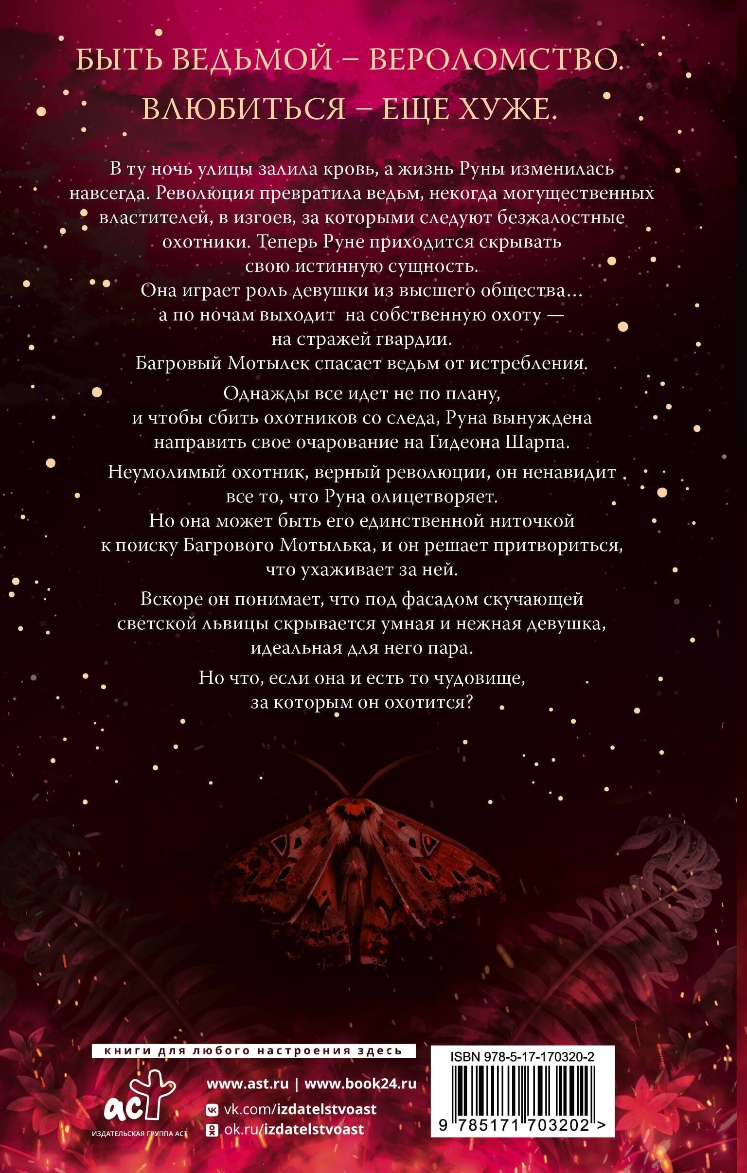 В ту ночь улицы залила кровь, а жизнь Руны изменилась навсегда. Революция превратила ведьм, некогда могущественных властителей, в изгоев, за которыми следуют безжалостные охотники. Теперь Руне приходится скрывать свою истинную сущность. Она играет роль девушки из высшего общества… а по ночам она выходит на собственную охоту — на стражей гвардии. Багровый Мотылек спасает ведьм от истребления.
