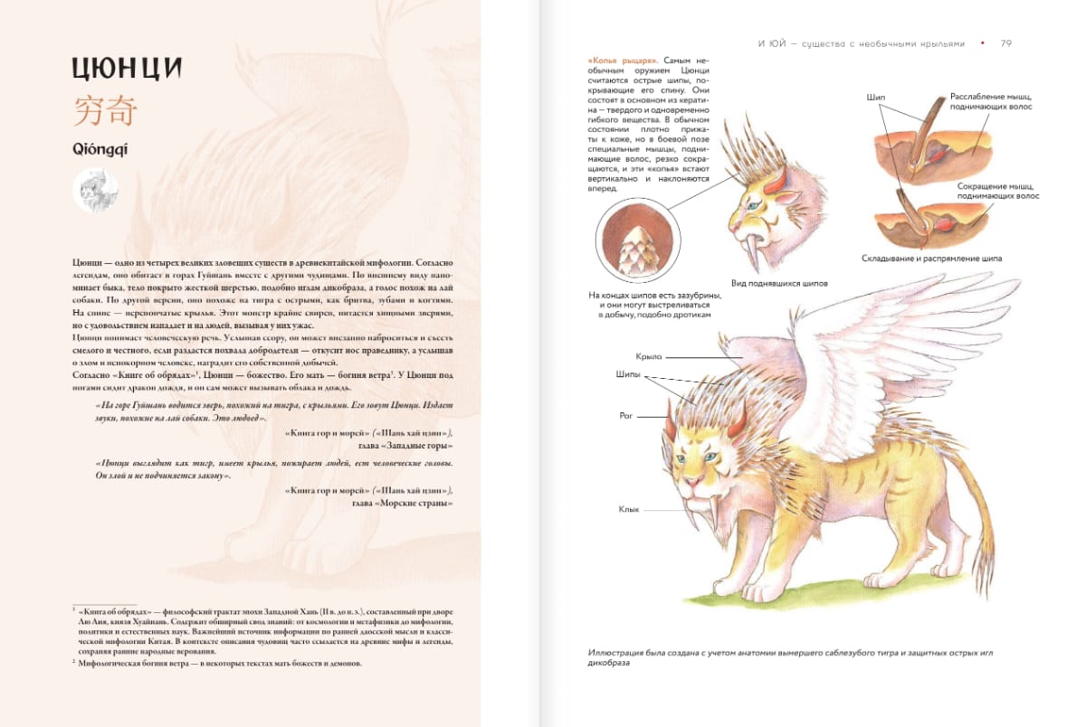 Откройте этот артбук — и древние существа оживут на ваших глазах. Здесь собраны иллюстрации, описания и биологическое особенности 40 мифических существ из древнекитайского трактата «Книга гор и морей». Каждое существо сопровождает яркая иллюстрация, древние предания, цитаты из «Книги гор и морей», описание внешнего и внутреннего строения создания. Вы встретите Инлуна, способного призывать дожди, Чжулуна, влияющего на времена суток и года, птицу Лэй с двумя головами, управляющую огнем, безликого светящегося Дихуна, рыбу с куриными лапками Цзоу Юй и многих других удивительных созданий.