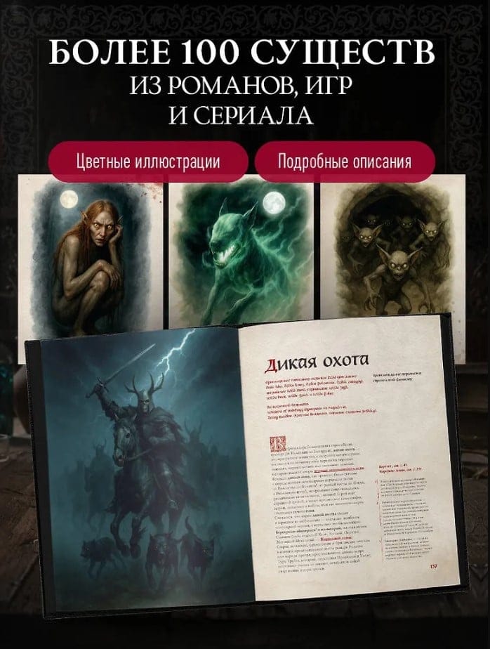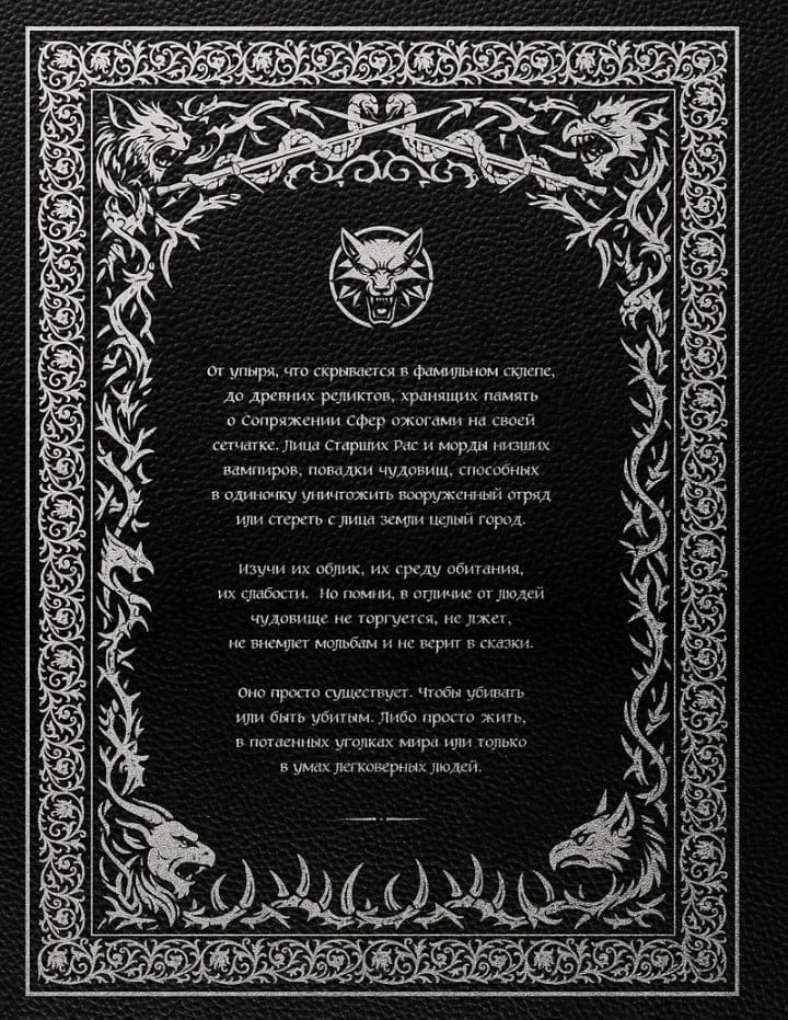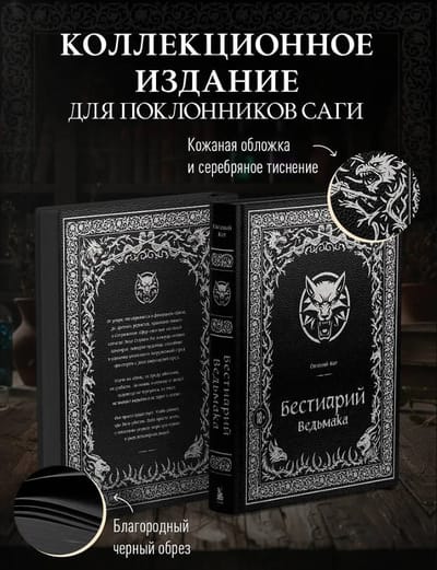 Эта книга — настоящее сокровище для поклонников вселенной Ведьмака. Шелест плотных страниц (с рукописными пометками на полях от бывшего владельца-ведьмака) перенесет тебя в душные топи Велена или на морозные берега Скеллиге. А качественная цветная печать позволит рассмотреть всех чудовищ очень пристально, чтобы ничего не упустить! Про красоту обложки (которая, кстати, на ощупь как шкура виверны) и говорить нечего! Ну, и чтобы ты всегда знал, на какой твари остановился, и не приходилось загибать углы страниц — черная атласная лента-ляссе!