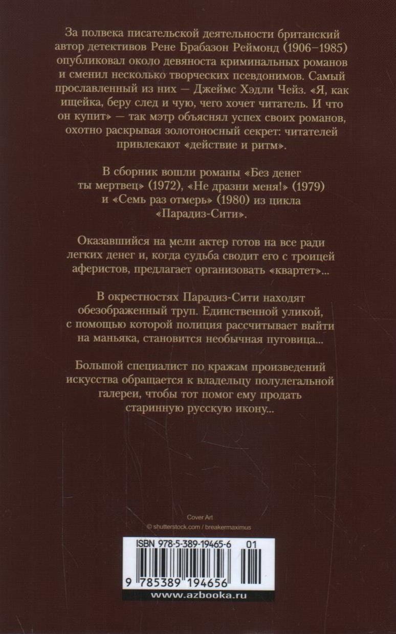За полвека писательской деятельности британский автор детективов Рене Брабазон Реймонд (1906–1985) опубликовал около девяноста криминальных романов и сменил несколько творческих псевдонимов. Самый прославленный из них — Джеймс Хэдли Чейз. «Я, как ищейка, беру след и чую, чего хочет читатель. И что он купит» — так мэтр объяснял успех своих романов, охотно раскрывая золотоносный секрет: читателей привлекают «действие и ритм». В сборник вошли романы «Без денег ты мертвец» (1972), «Не дразни меня!» (1979) и «Семь раз отмерь» (1980) из цикла «Парадиз-Сити». Оказавшийся на мели актер готов на всё ради легких денег, и когда судьба сводит его с троицей аферистов, предлагает организовать «квартет»... В окрестностях Парадиз-Сити находят обезображенный труп. Единственной уликой, с помощью которой полиция рассчитывает выйти на маньяка, становится необычная пуговица... Большой специалист по кражам произведений искусства обращается к владельцу полулегальной галереи, чтобы тот помог ему продать старинную русскую икону...