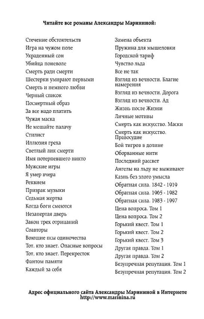 Неизвестному писателю Андрею Кислову крупно повезло. По его единственному роману, изданному за свой счет, хотят снять сериал и предлагают солидный гонорар. Разумеется, тот с радостью соглашается. А потом внезапно объявляет, что не подпишет договор ни на каких условиях. На кону большие деньги, и к выяснению причин столь загадочного отказа привлекают сотрудника частного детективного агентства — Настю Каменскую. Но вскоре та становится главным подозреваемым в деле об убийстве. Конечно, ну а кто же еще! Ведь это она, Настя, грязно домогалась потерпевшего, угрожала ему... Он сам рассказывал об этом перед смертью, да и другие свидетели имеются…