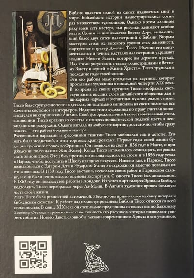 Синодальный перевод Нового Завета Библии (четыре Евангелия, Деяния святых апостолов, двадцать одно послание апостолов и Откровение Иоанна Богослова) в этой книге украшают более трехсот великолепных цветных рисунков, выполненных выдающимся живописцем, портретистом и гравером Джеймсом Тиссо (1836–1902). Его монументальные и точные в деталях иллюстрации делают это издание Нового Завета поистине уникальным.