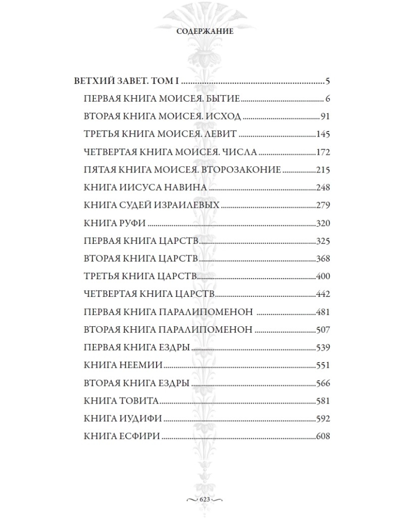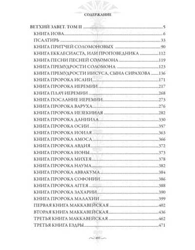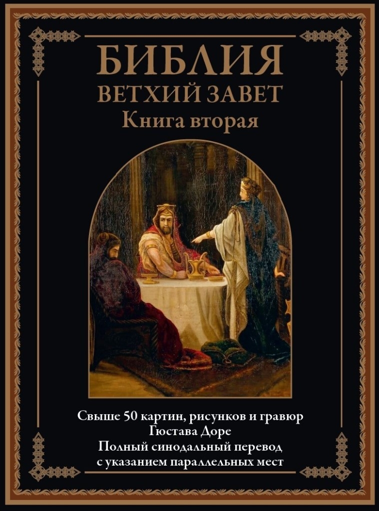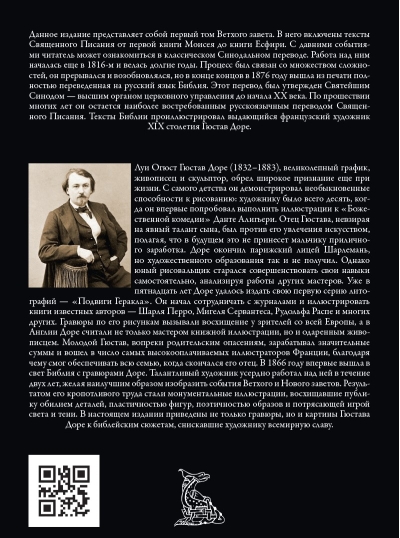 В настоящем издании представлены тексты Ветхого завета от Пятикнижия Моисея до книги Есфири в классическом Синодальном переводе. Книга украшена работами талантливого французского живописца и графика Луи Огюста Гюстава Доре. В 1866 году Библия с гравюрами Доре впервые была продемонстрирована восторженной публике. Детальные, выразительные иллюстрации имели грандиозный успех и прославили художника в веках. В данном издании приведены как гравюры, так и картины Доре, запечатлевающие события Священного Писания.