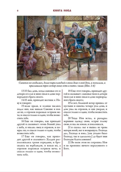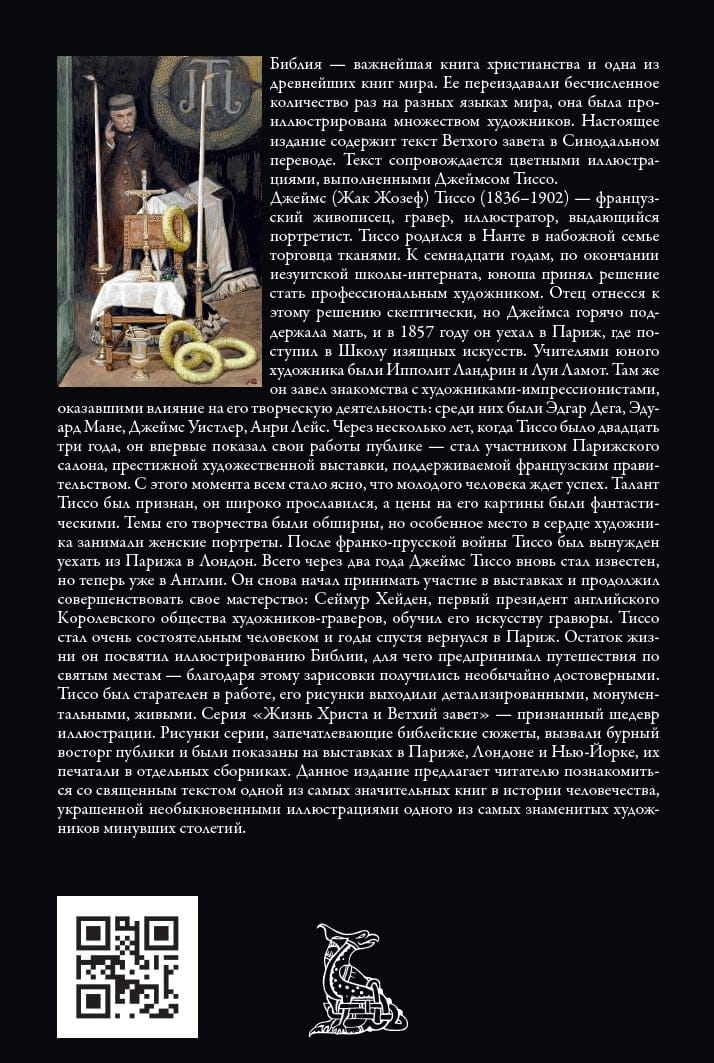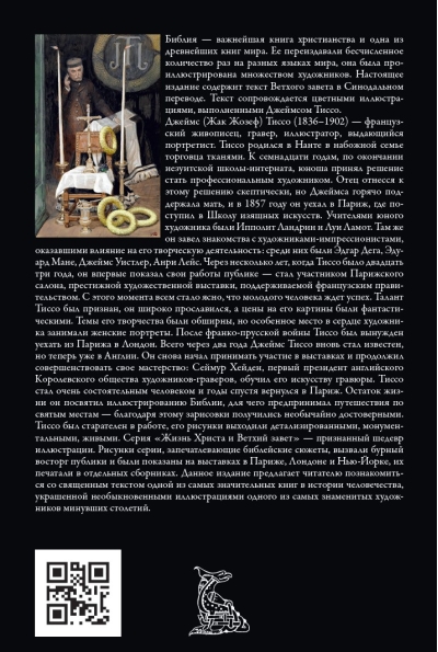 Библия — важнейшая книга христианства, одна из древнейших книг мира и значительнейших книг в истории. Ее переиздавали неисчислимое количество раз на разные языки мира, она была проиллюстрирована множеством талантливых художников. Красота и многообразие текста Ветхого завета в данном издании представлены в Синодальном переводе. Текст сопровождается цветными иллюстрациями, выполненными одаренным французским художником Джеймсом Тиссо.